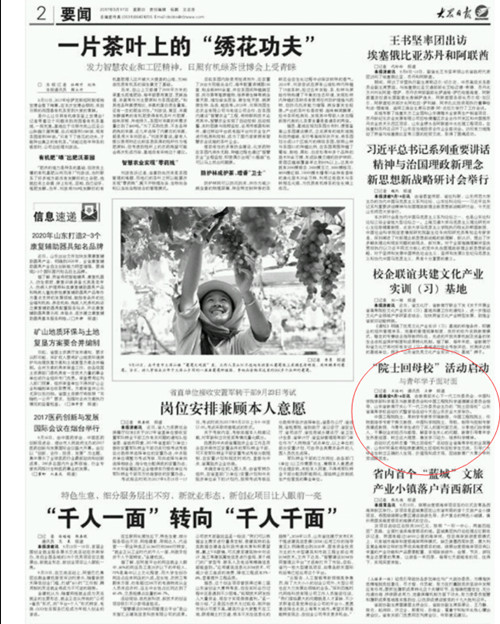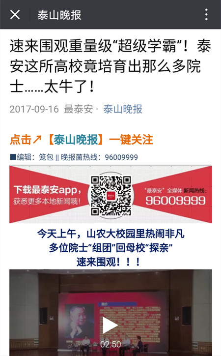 活动也在各大新媒体平台上引发了高热度。山东广播电视台“闪电新闻”客户端记者在活动现场就进行了主题推送。山东省权威新闻发布平台“山东24小时”客户端,山东省教育厅官方微博,齐鲁晚报、泰山晚报微信公众号等纷纷创新形式,对活动进行了生动报道。大众网教育频道总监白卫表示,新闻在“山东24小时”上线后,广大网友踊跃为山东农业大学点赞,短短十几分钟评论就超过200条,长时间占据头条位置。泰山晚报以“速来围观重量级超级学霸,泰安这所高校竟培养出那么多院士”为题,详细介绍了我校培养的9位两院院士背景资料,吸引了大量粉丝的转载。泰山晚报记者张振男表示,作为驻泰高校的旗帜,山东农业大学一直是泰安人民的骄傲,这次深入了解到学校人才培养的辉煌成就,确实感觉很震撼。我们很多新闻同行都说,山东农业大学有底蕴、有实力、有情怀、有梦想,相信学校明天一定会更加美好。