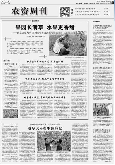 12月21日,《农民日报》以《果园长满草 水果更香甜》(通讯员:杨宇 张铁成 记者:吕兵兵)为题,用超过1/2个版面报道了我校陈学森团队“果园生草省力高效培肥地力法”技术转让纪实。文章说,近日,山东省烟台烟富农业科技有限公司与山东农业大学签订协议,以15万元的价格获得该校陈学森教授的“果园种植长柔毛野豌豆的省力高效培肥地力法”技术的独家使用权。长柔毛野豌豆是一种常见的豆科野草,匍匐在地上生长,很不起眼,大多数人不认识它。15万元,无论对一家企业还是一所高校而言,都算不上“大钱”。但这份技术转让合同的签订,却是写就了一篇打造生态果园、推进水果产业健康发展的大文章。(阅读全文请点击图片)