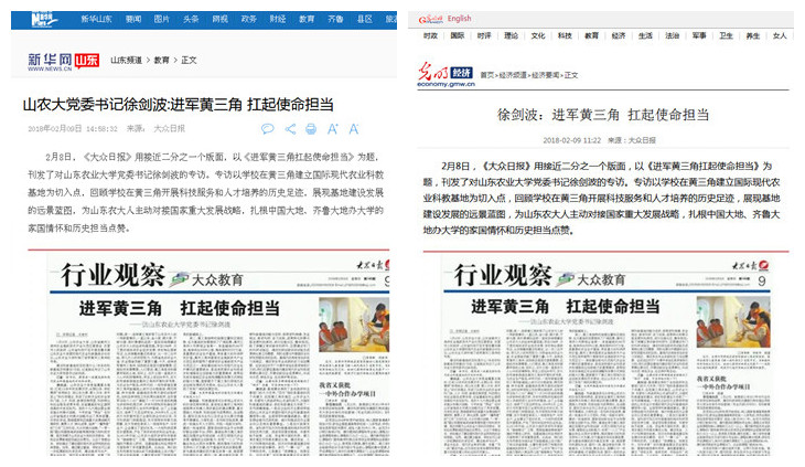 2月8日,《大众日报》以《进军黄三角 扛起使命担当》为题,刊发了对山东农业大学党委书记徐剑波的专访。新华网、光明网都在第一时间进行了转载。新浪网将新闻链接放在了主站显著位置,微博“新浪山东”也进行了专题推送。2月28日,今日头条在其平台上抓取大众网头条号《山东农大党委书记徐剑波:进军黄三角 扛起使命担当》报道,进行了全网推荐,截止目前,阅读人数已经突破100万。在百度上检索山东农业大学“进军黄三角”“国际现代农业科教基地”等主题,相关链接已经达到几十万条。