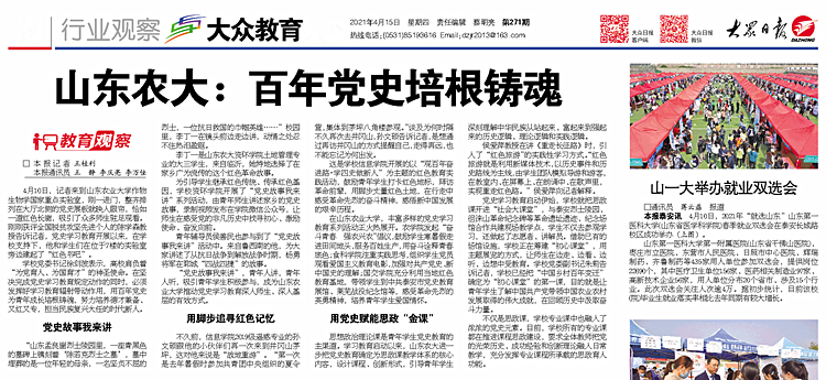 4月15日,《大众日报》以《山东农大:百年党史培根铸魂》为题,聚焦山东农业大学开展党史学习教育最新进展,点赞学校把党史学习教育融入立德树人全过程,引导青年学生坚定理想信念,传承红色基因,努力成长为德智体美劳全面发展的社会主义合格建设者和可靠接班人。