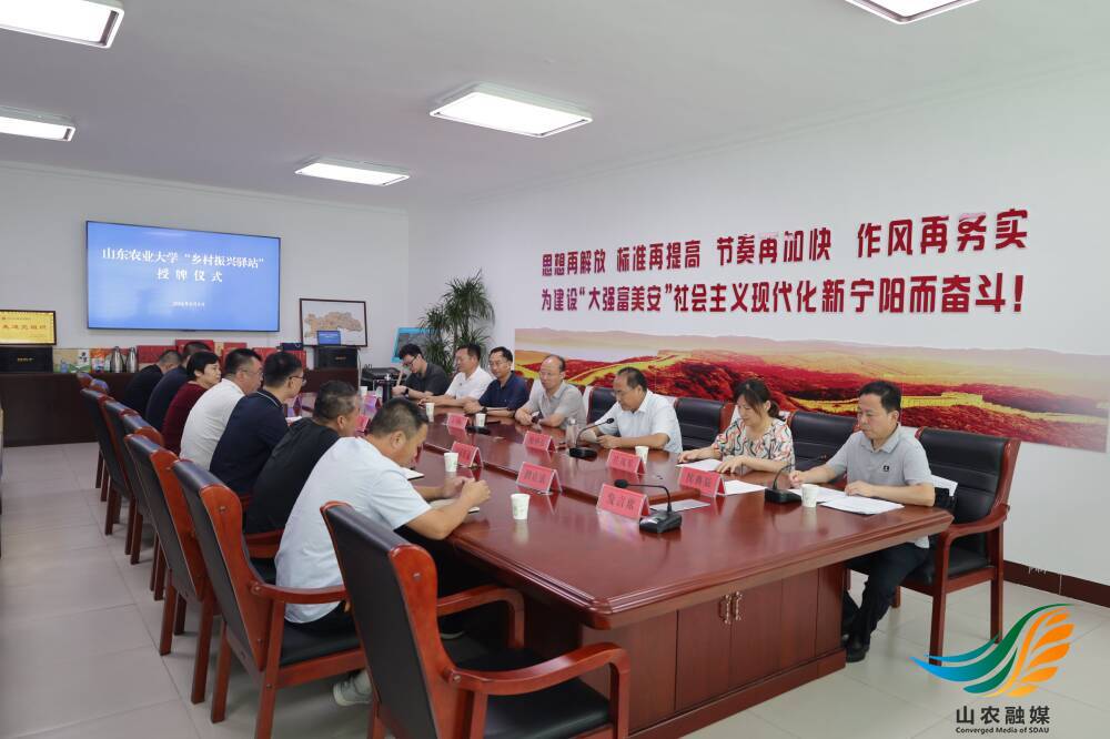 山农融媒8月12日讯 8月9日,学校在泰安市宁阳县开展乡村驿站授牌仪式。动物医学院党委书记朱宝库,宁阳县政府党组成员鲍怀东出席活动并为驿站授牌,宁阳县农业农村局局长侯典辰主持会议。