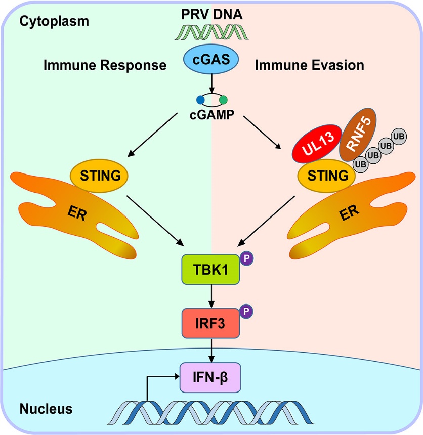 PRV属于疱疹病毒家族的典型成员,由PRV感染引起的伪狂犬病是严重危害养猪业的重大疫病之一。除猪以外,PRV感染还可引起多种家畜、犬、猫、实验动物和野生动物发病或死亡。潜伏感染是控制和根除伪狂犬病的重大挑战,目前认为免疫逃逸是造成疱疹病毒潜伏感染的重要原因,但疱疹病毒免疫逃逸的机制仍有待深入研究。环鸟腺苷酸合成酶(cGAS)是新近发现的细胞内主要DNA识别受体。当病毒感染细胞时,胞浆中的cGAS能够识别病毒DNA并与之结合,一旦结合DNA后cGAS的酶活性即被激活,并合成内源性第二信使环鸟腺苷酸(cGAMP)。cGAMP进而活化接头分子STING,最终诱导I型干扰素产生和抗病毒蛋白表达。因此,cGAS-STING通路是机体防御DNA 病毒感染的关键信号通路。疱疹病毒是有囊膜的双链DNA病毒,最近的研究显示,多种疱疹病毒能够以不同方式作用于cGAS-STING信号通路抑制I型IFN产生,进而实现免疫逃逸。对于PRV是否通过调控cGAS-STING信号通路而实现免疫逃逸并不清楚。