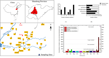 兽用抗生素和微量重金属曾长期作为添加剂广泛应用于畜禽养殖生产中。而抗生素及重金属滥用是导致畜禽养殖环境抗生素和重金属残留的根本原因,导致环境中出现耐药菌和抗性基因,具有重要的公共卫生意义。畜禽环境中的重金属和耐药致病菌会导致畜禽生产性能下降和重大经济损失,从而导致潜在的环境和公共卫生安全问题。本研究评估了山东省大汶河流域奶牛场废水中人畜共患致病菌大肠杆菌耐药特征和重金属污染状况。结果发现:从废水中分离出的大肠杆菌主要对β-内酰胺类和四环素类抗生素具有抗性;风险评估结果表明,铁的污染指数最高,可能会导致生态污染。研究结果将为奶牛场细菌性疾病的治疗以及我省奶牛场的污水净化提供指导。