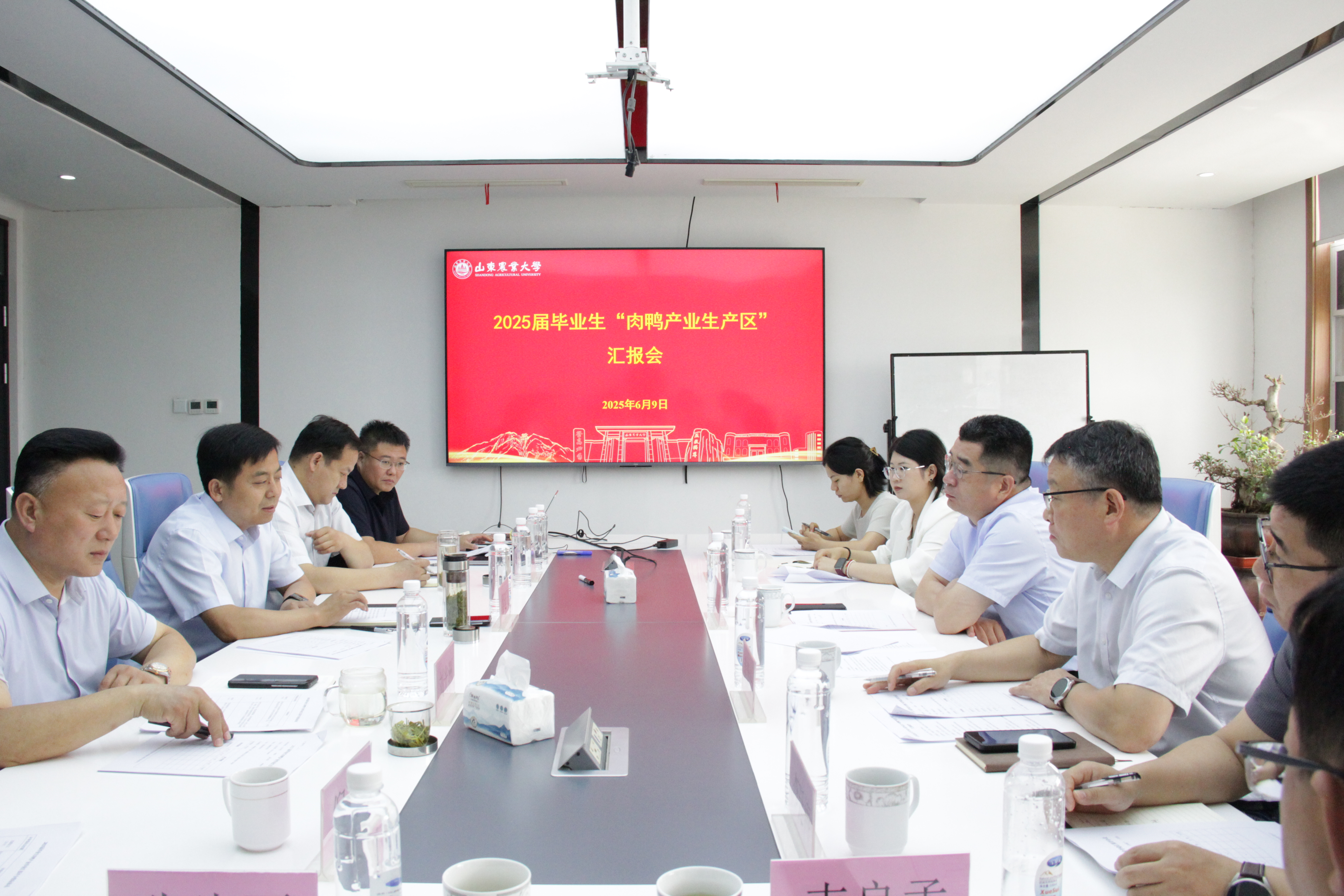 2025年6月9日上午,山东农业大学2025届毕业生“肉鸭产区”的成果汇报会,于新泰天信农牧发展有限公司成功举行。山东农业大学副校长高立明、动物医学院院长姜世金、天信农牧发展有限公司董事长刘光洲,以及地方政府领导、山东农业大学相关工作人员共同出席了此次会议。