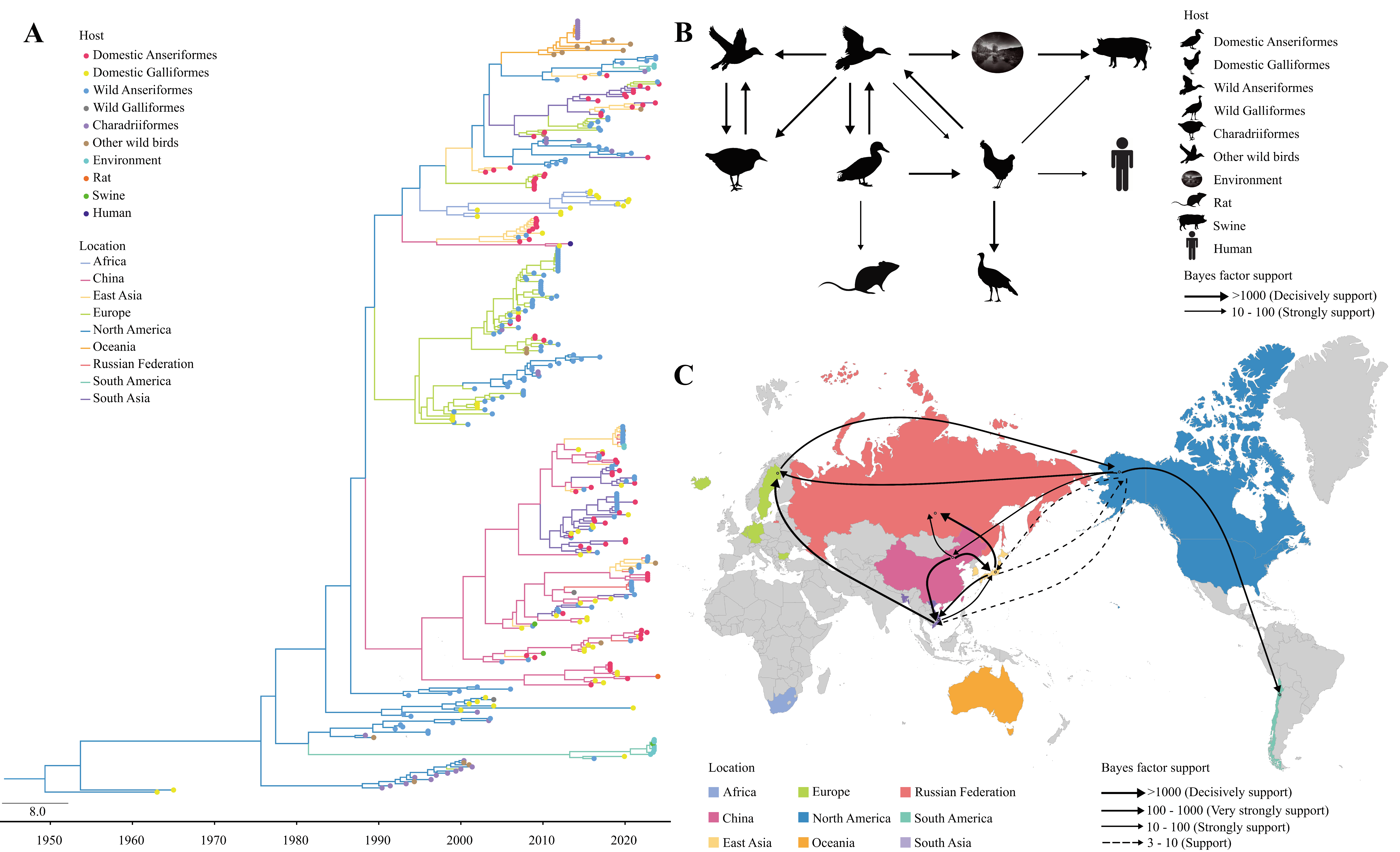 本研究发现,全球H6 IAV可明显分为欧亚和北美两个大分支,已在全球至少40个国家检测到,其中约68.3%的病毒分离自亚洲国家,且宿主为家禽(主要是鸡、鸭和鹅)的占比超过一半,值得注意的是,共有5株病毒分离自哺乳动物,如猪、鼠以及人类;从时间来看,自1965年首次从美国火鸡中分离出来以来,H6 IAV一直呈现波动上升趋势,并于2014年达到峰值;从亚型来看,H6N2和H6N6是全球H6 IAV的两种优势亚型组合。进一步的贝叶斯谱系动力学分析表明,北美、东亚和南亚地区在全球H6 IAV扩散过程中起着重要的核心作用,而野生雁形目、家养鸡形目和家养雁形目禽类是全球H6 IAV在不同宿主间传播的3个重要的中间宿主,其中家养鸡形目禽类是病毒传播至人类的“中间媒介”。上述研究结果突出了H6 IAV对全球公共卫生的潜在威胁,并强调应加强对家禽中流行的H6 LPAIV监测的必要性。