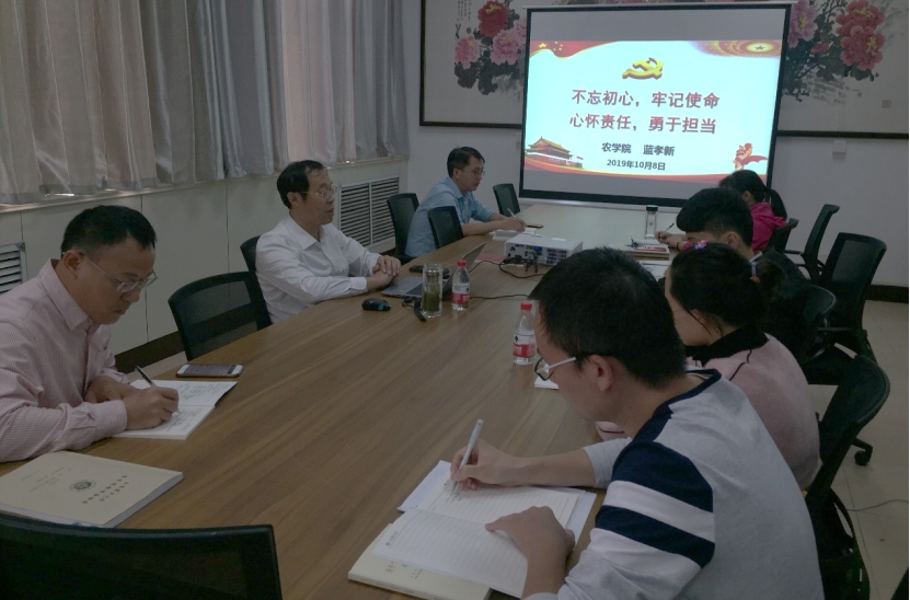 10月8日下午,农学院副院长蓝孝新为种子科学与工程党支部讲党课,党支部全体党员、入党积极分子以及课题组学生党员参加。 蓝孝新围绕“不忘初心、牢记使命,心怀责任、勇于担当”主题,主要从共产党人的初心和使命、如何理解共产党员的担当、如何做到心怀责任,勇于担当、新时代高校党员应有怎样的责任担当四个方面讲授。他讲到,初心就是一个人做事做人的原始动力、原始心愿。初心给了我们一种积极进取的状态。共产党人的初心就是为中国人民谋幸福、为中华民族谋复兴。作为共产党人必须始终牢记初心使命,强化责任担当;勇于担当是共产党员的优秀政治品质;作为新时代高校党员应坚定理想信念,牢记初心使命;要立足本职岗位,爱岗敬业奉献;要兢兢业业工作,争创一流业绩;要坚持终身学习,强化教育技能;要加强团结协作,正视荣誉名利;要遵纪守法自律,严守学术诚信。 参会人员就党课学习交流了心得体会,并对下一步如何加强思政德育教育进行了探讨。大家表示今后会继续做好理论学习,立足学科专业实际,将思政德育教育渗透到教学、科研、学生指导的各各环节,不忘初心、牢记使命,为学院更好更快发展贡献力量。