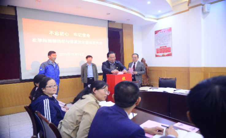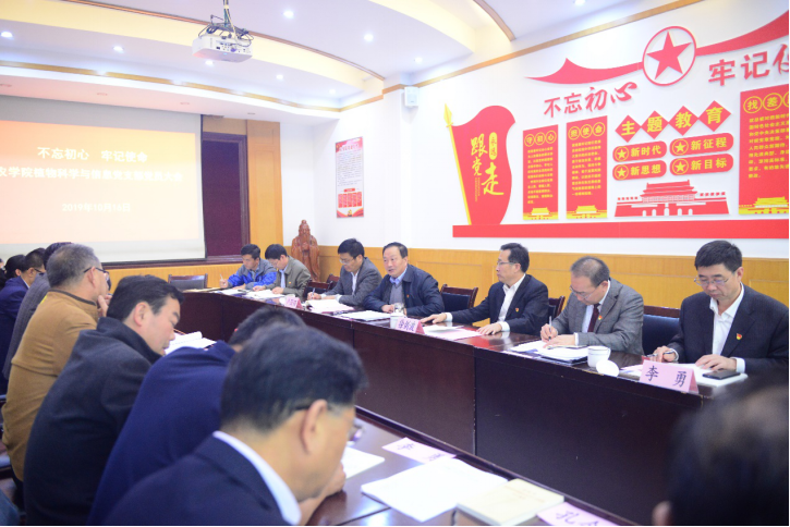 宁堂原 10月16日,农学院植物科学与信息党支部(教工第一党支部)在4号楼335会议室召开支部全体党员大会,学校党委书记徐剑波以普通党员身份参加,指导支部委员候选工作,与大家一起学习习近平总书记关于“不忘初心、牢记使命”主题教育重要论述,听取支部上季度工作开展情况汇报和支部成员围绕“贯彻新发展理念,加快新农科发展”的研讨发言。