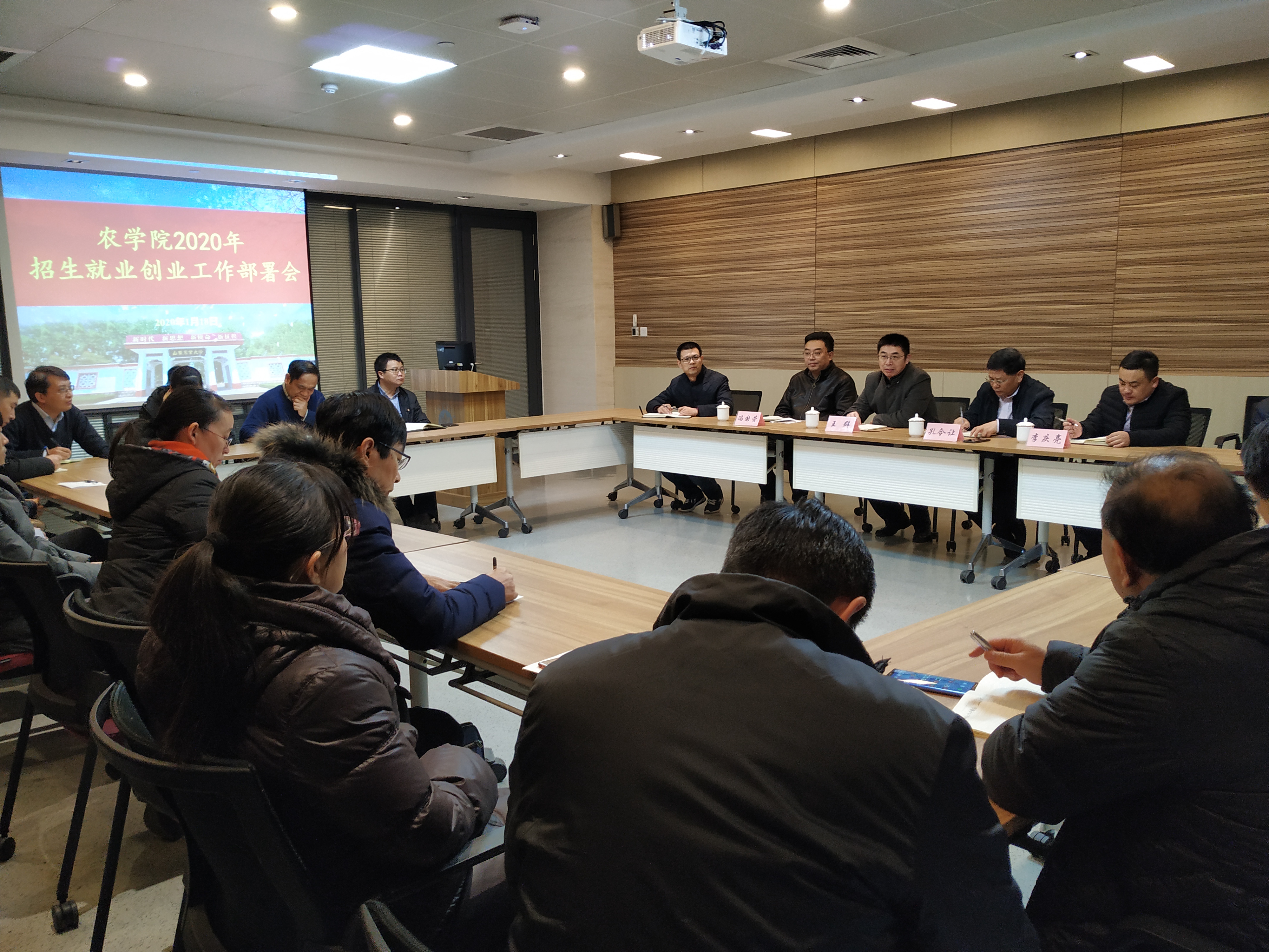 1月18日上午,农学院于国重楼234召开2020年招生就业创业工作部署会,学工处处长王群出席会议并讲话,围绕招生就业工作做出重要部署。院长孔令让、学工处副处长冯国营、创新创业中心主任李庆亮及学院专业主任、青年教师参加会议。 王群指出,招生就业工作是学校的生命线,是评估学校和学院人才培养质量的重要指标。今年实行的新高考改革为招生工作带来了新的挑战,希望学院能够统一思想、提高认识,做好学科发展和专业建设,积极发动教师、学生、校友等多方力量,用学生喜闻乐见的形式做好招生宣传。冯国营围绕就业工作提出了“全员参与”和“一体化推进”的工作思路,把就业工作贯穿大一到大四,为学生做好职业选择和就业指导。 针对创新创业赛事,冯国营提出,学院要充分发挥自身的科研优势,做好技术与产业的结合,挖掘好的项目,打造好的团队,将项目培育过程与人才培养相融合,提高学生的创新意识和创业能力。李庆亮通过分析近五年“互联网+”创新创业大赛的数据介绍了赛事的规模和成绩,解读了相关政策及参赛的注意事项等。 会议最后,孔令让对学院今年的招生宣传、就业推进、创新创业赛事筹备等方面提出了明确要求。下一步,学院将继续推进三全育人,切实做好学科建设,培养创新型人才。