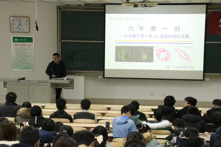 12月4日下午,农学院青年讲师团成员倪飞老师在综合楼N204为2019级同学宣讲“六年磨一剑 -- 太谷核不育小麦Ms2基因的图位克隆”的故事。 倪飞老师以幽默风趣的语言,简单介绍了自己的科研经历,六年磨一剑,最终成功发表“太谷核不育小麦Ms2基因的图位克隆”。他总结到:“选择自己热爱的东西,不要半途而废,而应该按部就班、坚持到底。” 2019级农学3班徐峻岩表示:“老师们的讲述,不仅让我更深入地了解到最新的农业研究前沿,而且激发出我对专业学习和参与科研创新的兴趣。”
