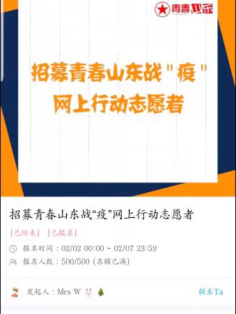 志愿服务工作:为响应党的号召,省团委号召。作为共青团员,积极报名参加青春山东战“疫“网上志愿者,并帮助省团委制作大学生为武汉加油视频,视频会在山东共青团平台宣传 姓名:陈聪丽 班级:18级农学免一班