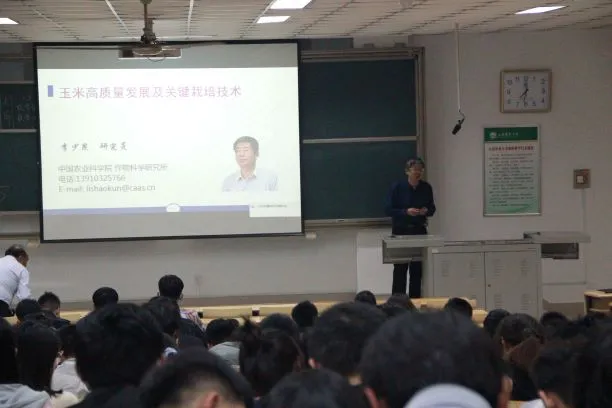 李少昆研究员从玉米种植面积扩大及玉米单产增长的原因、新时期玉米生产面临的形式等方面出发,向同学们传递出当前农业学科的前沿科研进展,条理清晰,通俗易懂。 他结合自身工作经历,就玉米生产面临的主要问题和限制因素、玉米高质量发展的应对途径、玉米生产关键技术展开详细讲解,启发了同学们对专业的兴趣和科研的思考。