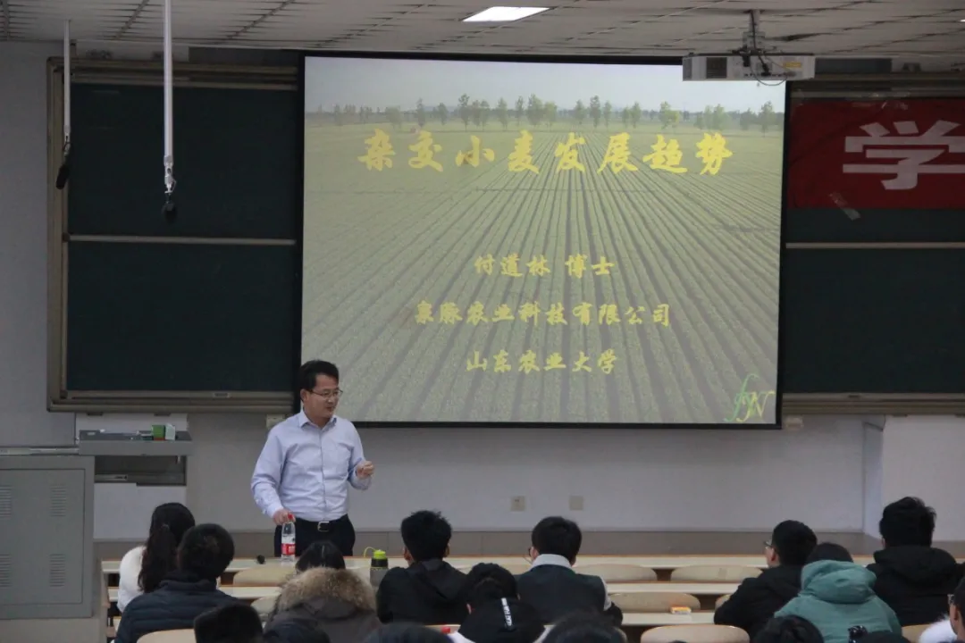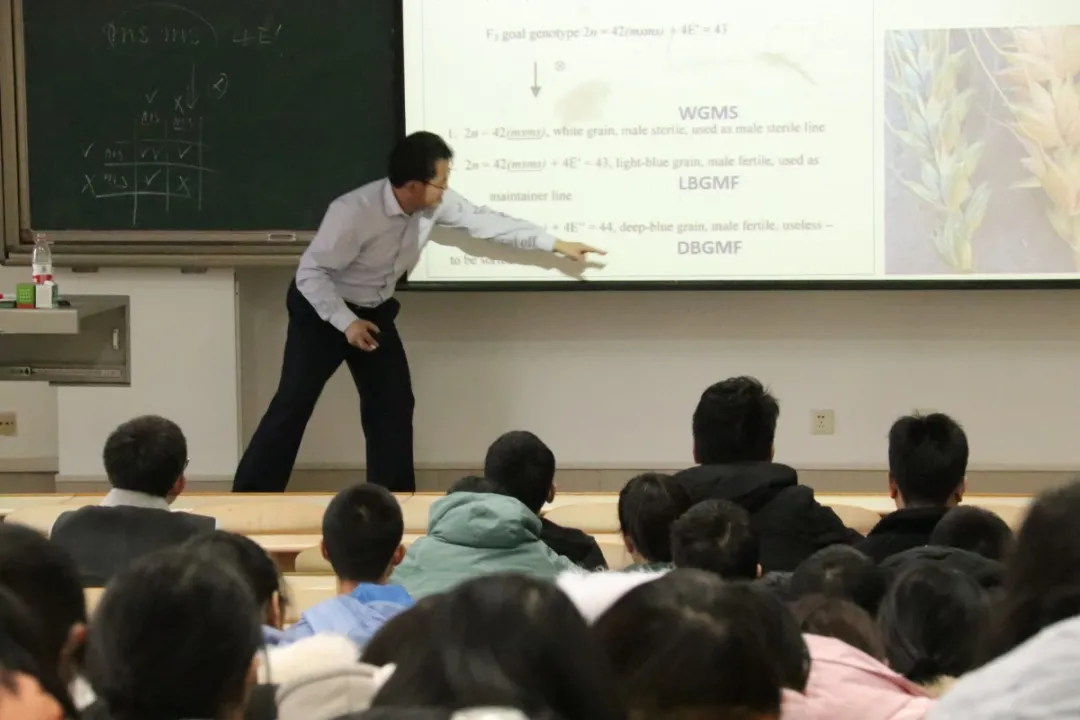 讲堂上,付道林老师以“杂交小麦发展趋势”为主题,结合生动有趣的事例,详细讲解了小麦的杂种优势。他指出,杂交小麦的种植方式不同于传统普通小麦,这是杂交小麦无法大量种植的一个重要原因。在报告过程中,付老师问答结合,充分调动同学们的学习积极性,课堂氛围轻松活跃。倪飞老师则以幽默风趣的语言,简单介绍了自己的科研经历,六年磨一剑,最终成功发表“太谷核不育小麦Ms2基因的图位克隆”。他总结到:“选择自己热爱的东西,不要半途而废,而应该按部就班、坚持到底。”最后,本期学实大讲堂在热烈的掌声中圆满结束。