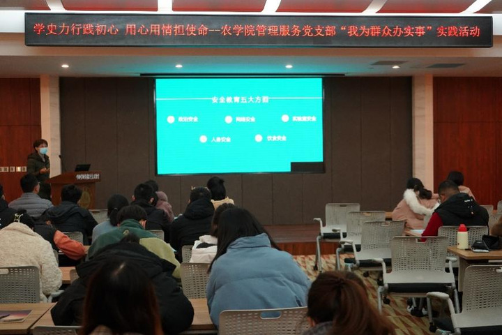 为增强同学们的安全意识,提升研究生的安全防护能力,农学院于2021年11月10日在国重楼报告厅举行了研究生安全专题教育活动。学院管理服务党支部党员教师、部分研究生参加了本次活动。