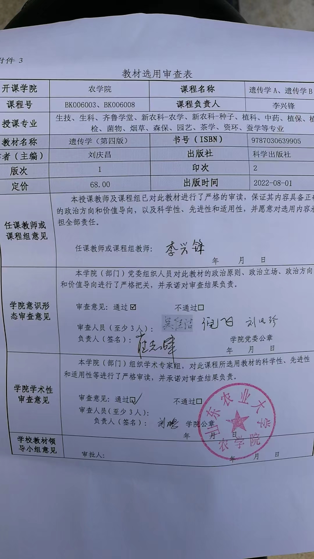 为加强教材管理,切实提高教材选用价值导向,根据教育部《普通高等学校教材管理办法》《山东农业大学教材管理办法》等相关要求,学院开展了2022-2023学年第二学期新增选用教材审查工作,现公示如下: