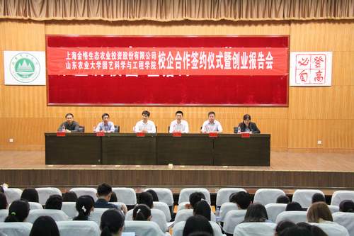 5月8日,园艺学院与上海金恪生态农业投资股份有限公司校企合作签约仪式暨创业报告会在南校区第一学术报告厅举行。山东农业大学党委常委、副校长高东升、上海金恪生态农业投资股份有限公司总裁王鹏、山东农业大学学工委书记、学工处处长王群、园艺学院党委书记王再兴、园艺学院院长郝玉金、党委副书记董进波出席会议,园艺学院2013、2014级学子及学院创业团队成员共同参加了此次会议。