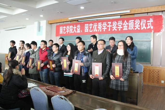 云南大益爱心基金会由云南勐海茶厂和云南大益茶业集团共同发起,是中国茶叶行业企业首家独立出资成立的爱心基金会,2014年被云南省民政厅评定为5A等级基金会。2012年,大益爱心基金会与学校签订“爱智美三位一体大学生公益项目”协议,并出资40万元在我校设立“大益奖学金”,用于奖励在校优秀学生。“园艺优秀学子”奖学金是由中国工程院院士束怀瑞出资设立,并得到多位学院优秀校友的大力支持,旨在奖励学习成绩突出、创新创业能力强、文体综合素质全面的优秀学生。经过层层选拔,此次共评选出大益学习之星、大益茶学之星、大益创新创业之星、大益自强之星、大益优秀学生干部和大益优秀研究生共47人、2014-2015年度园艺优秀学子12人。