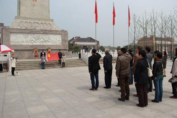 在"革命烈士永垂不朽"纪念碑前党员代表向革命烈士敬献花篮,中国工程院院士束怀瑞、院党委副书记董进波整理挽联,参加本次活动的党员共同向革命烈士默哀,面向党旗重温入党誓词,参观了英雄纪念碑雕塑及展厅。展厅内运用珍贵的照片、文物等重现了台儿庄地区所发生的重大战役,记录了战争年代共产党将帅们在台儿地区的战斗足迹,颂扬了英烈为祖国的解放事业所立下的卓越功勋。