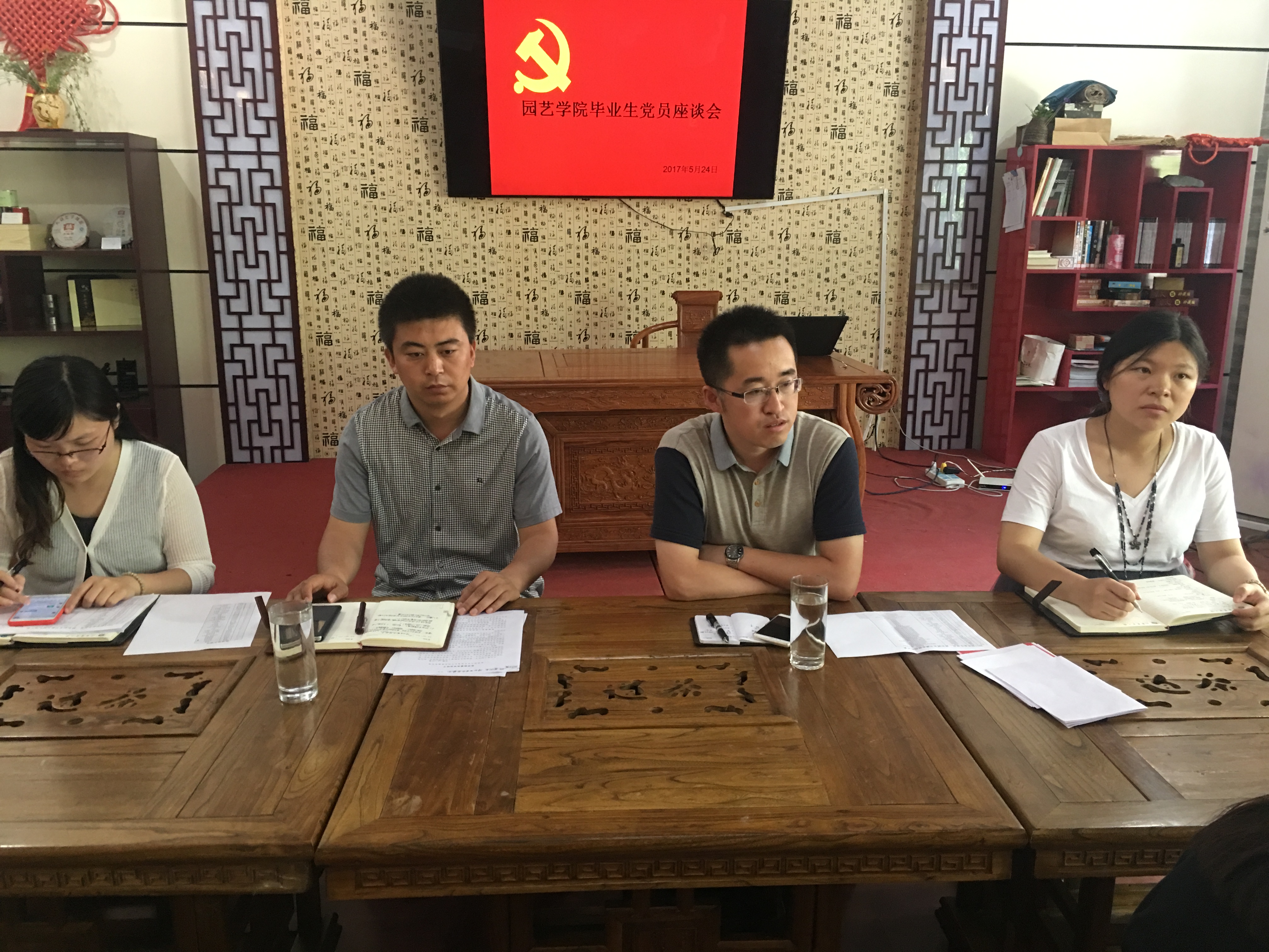 为迎接学校第七次党代会的召开,5月25日,园艺学院毕业生党员座谈会于南校区大益爱心茶室召开。园艺学院党委副书记张安涛,团委书记邹磊,团委副书记高姗、王超出席,2013级毕业生党员、班长团支书,以及2014级预备党员共同参加此次会议。