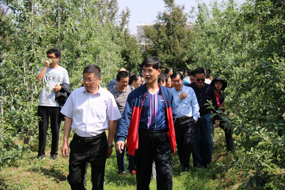 首先参观了设施果树课题组设施桃新品种选育及配套栽培技术温室,高东升教授从设施果树熟期调控、如何提高设施果树果实品质及配套栽培技术等方面简明扼要的介绍了课题组近年来关于设施桃选育的过程。目前课题组已选育鲁油系列等设施专用油桃新品种9个及一根棍傻瓜式配套栽培技术,另外还重新认识了设施果树的含义。教导年轻党员同志要跳出科研搞科研,跳出农业看农业,科研的最终目的是解放劳动力。接着参观了国家苹果工程技术研究中心成龄苹果树如何改造高干纺锤形的办法和效果。最后参观了农业部黄淮海设施农业工程科学观测实验站,李清明副教授详细讲解了观测站的地位、功能及用途,根据不能设施蔬菜设计建设了不同的温室墙体,达到现代栽培的目的,试验站还设置了温度、水分、湿度、风速等观测设备,为设施蔬菜生产提供基础数据。