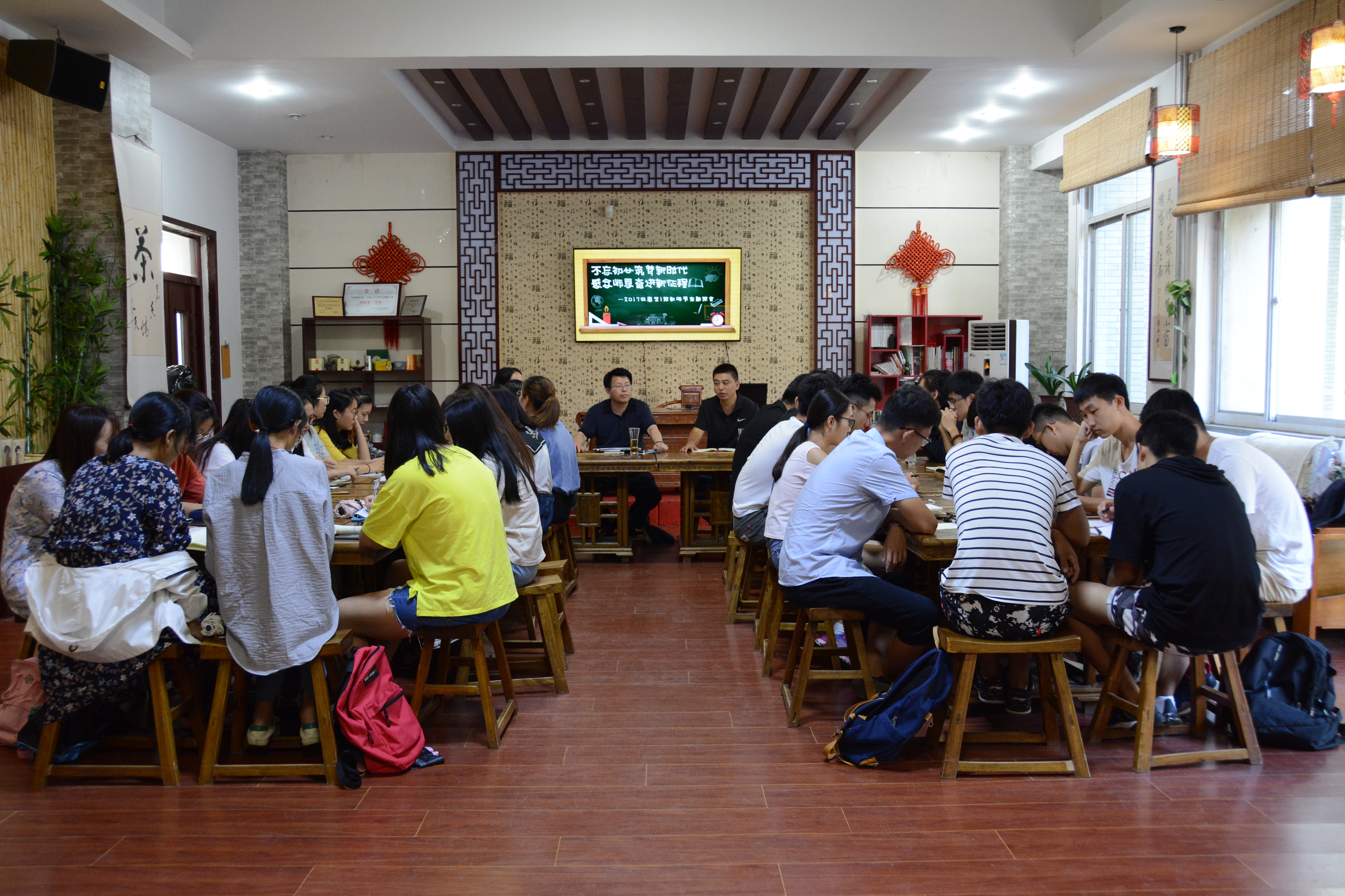 9月4日,2017级园艺一班于南校区实验楼大益爱心茶室召开“不忘初心筑梦新时代,感念师恩奋进新征程”主题班会。学校党委副书记杨天梅,学院党委副书记张安涛,学院团委辅导员安莲及园艺一班全体同学参加此次班会。