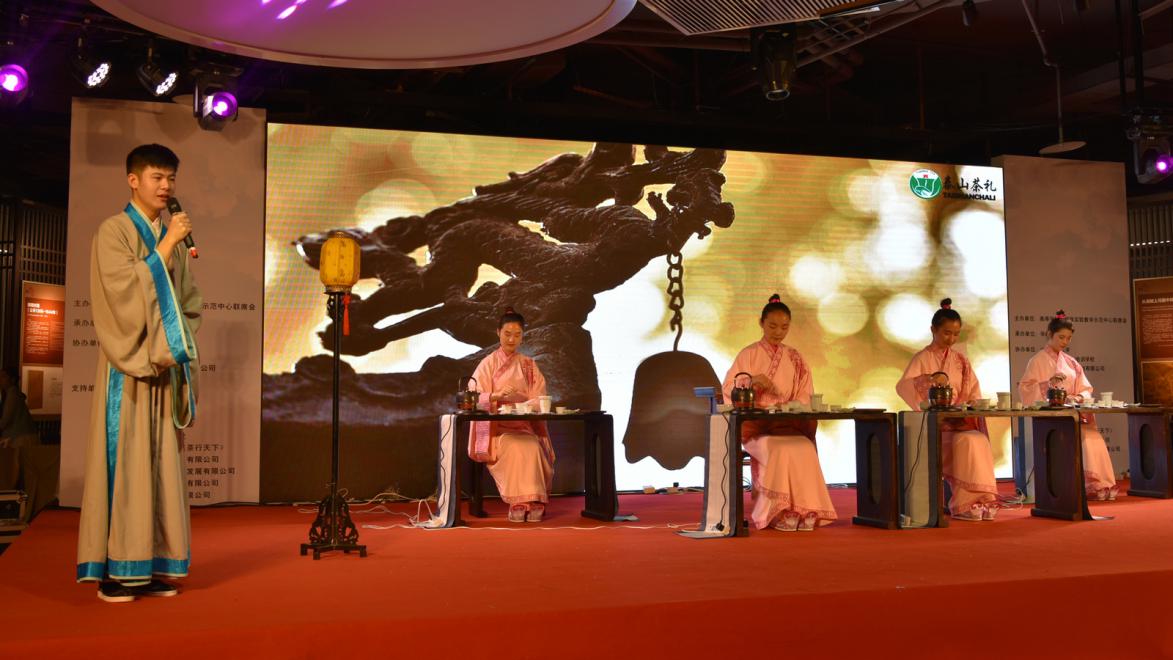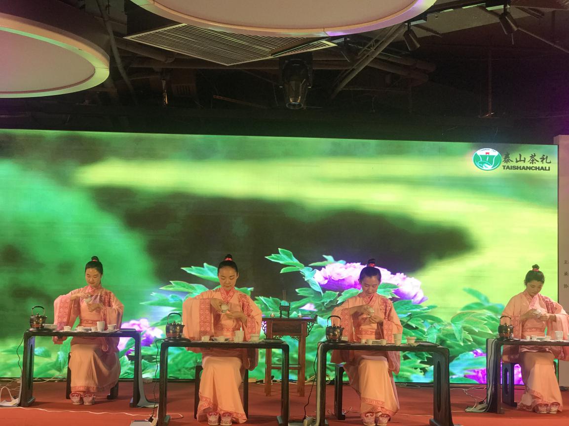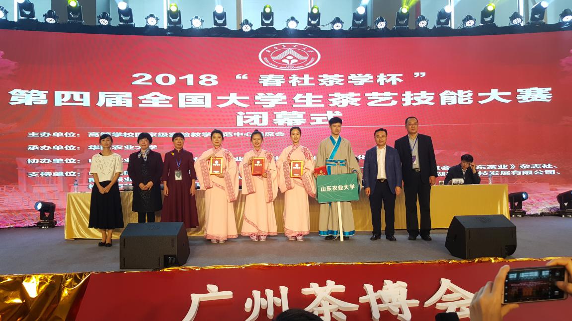 学校教务处、生物学基础实验教学中心、艺术系、园艺实验中心、茶学系领导老师与10名本科生、硕士生一同参加此次大赛。本次大赛设置团体赛和个人赛两大组别,并将赛事项目分为理论考试部分和技能竞赛部分。理论考试部分,个人赛参赛选手须进行有关茶及茶文化相关理论知识的考核。技能竞赛部分则分为团体赛和个人赛。其中,团体赛选手需自主创作一个具自主知识产权的茶艺表演节目,重点考察主题立意、团队合作、作品呈现效果及茶汤质量,全方位体现了茶学专业特色和专业技能。我校创作的团体赛节目为《泰山茶礼》,由2016级胡鲁齐同学担任解说,景宇、苏明洁、王漫、刘书达同学表演。该节目以泰山茶曾作为招待来到泰山封禅祭祀的帝王所用的茶品之史料为编创基础,以起舞迎宾、焚香祈福、礼敬香茗等环节展示泰山茶礼之庄重,将泰山文化与泰山茶文化充分融合,展示泰山之伟岸,表达“国山圣水,茶礼天下”之主题,展示大国大山之情怀。节目现场呈现磅礴大气,唯美庄重,文化厚重赢得现场观众和评委的一致好评,最终荣获团体一等奖。