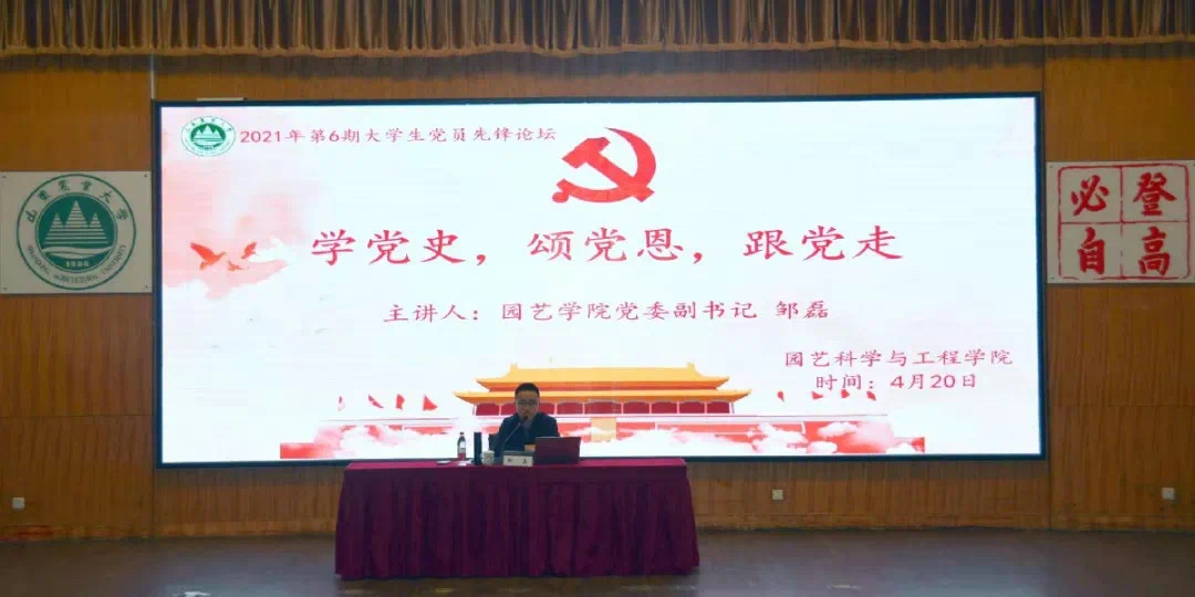 4月20日,园艺学院举办2021年第六期大学生党员先锋论坛,学院党委副书记邹磊以“学党史,颂党恩,跟党走”为主题,向园艺学院全体学生党员和入党积极分子作报告。