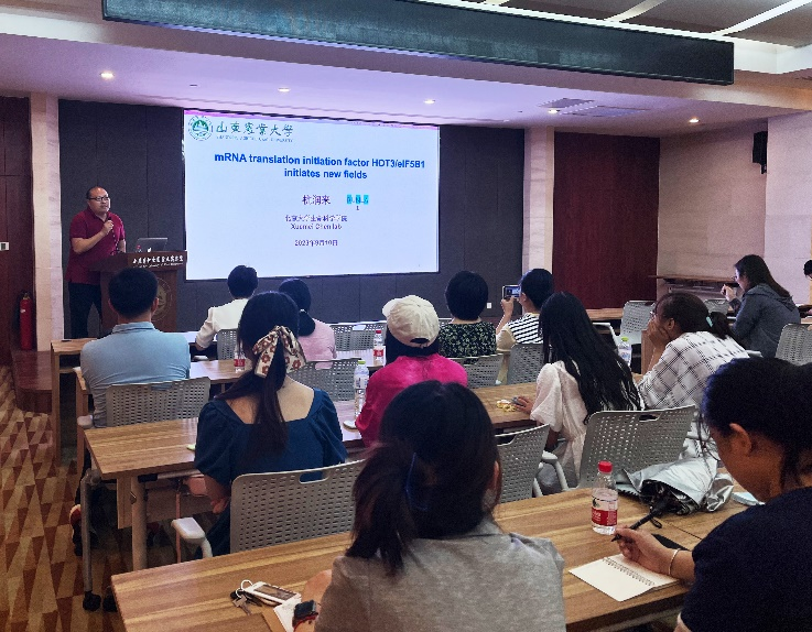会上,杭博士围绕植物翻译调控这一重要生物学过程,详细介绍了自己近年来在rRNA前体可变加工与低温胁迫、核糖体动态组装与核仁胁迫、以及胞质mRNA翻译起始和核糖体组装与sRNA生物合成等方面取得的最新研究成果,并就师生们提出的问题进行了详细地解答。同时,杭博士结合自己多年的求学和科研经历,勉励同学们要不负韶华、向着梦想奋勇前进。