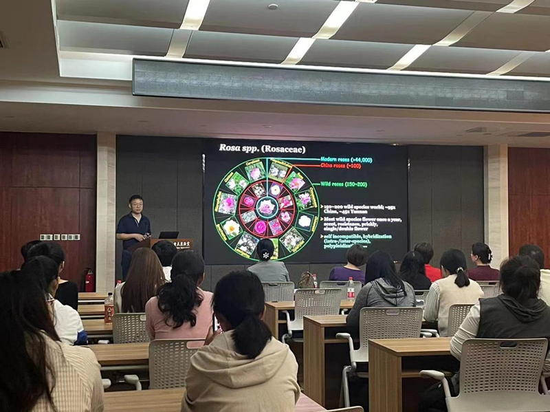 会上,胡金勇研究员围绕玫瑰皮刺的早期功能与发育起始以及遗传规律,详细介绍了自己近年来在构建多世代遗传群体和相关遗传图谱、利用多基因组学手段重构玫瑰皮刺发育基因调控网络、细胞层面3D结构变化和细胞动力学特征及动态等方面的最新研究成果,提出了“皮刺储水”假说,为我们进一步全面认识皮刺发育调控机制积累了关键信息。研究将为无刺玫瑰种质创新提供重要靶向基因资源。为解决玫瑰种业“卡脖子”困境提供基础数据。报告中,胡研究员也与师生进行了互动,详细的解答了师生提出的相关问题。