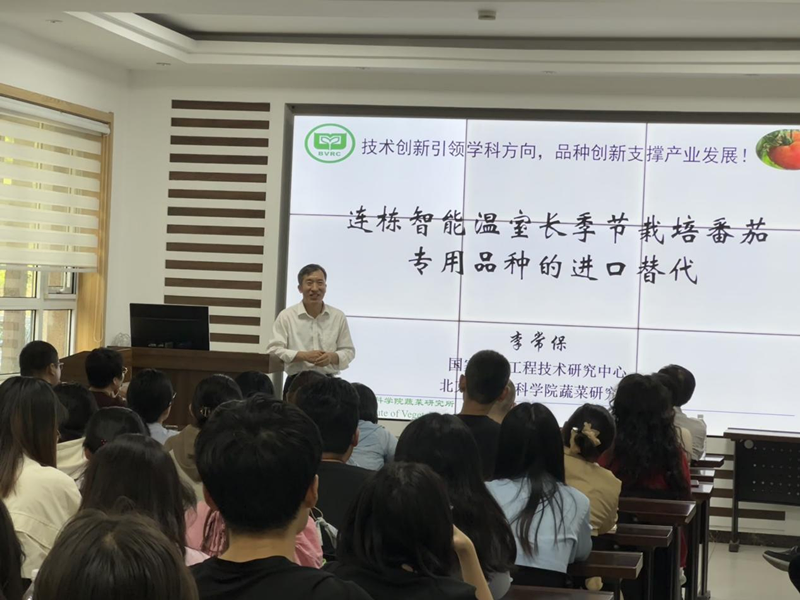 会上,李常保研究员提到自己本硕博均毕业于山东农业大学,这为他的研究道路奠定了基础,并与大家分享了番茄育种的一些个人观点,其中提到育种没有十全十美的,应当善于发现每一个品种的优点。还为大家介绍了我国番茄的种业现状与发展趋势,要从种质资源入手,贯彻“品质优先,产量并重,抗性兼顾”等原则,培育出“好种、好卖、好吃”的品种,实现服务三农的目标。随着我国对番茄种业的逐渐重视,李常保研究员带领团队,开展北京专项“连栋智能温室专用番茄新品种培育与示范应用”,通过科企联合携手攻关,种源自主可控,品种进口替代等解决途径,促使番茄种业飞速发展。最后李常保研究员提到种子是农业发展的核心载体,将继续培育更多番茄专用品种,优质优价发展番茄全产业链。报告结束,与会师生进行了积极的提问与交流,李常保研究员对大家提出的问题进行了耐心、细致的讲解,并对相关问题提出了建设性意见。