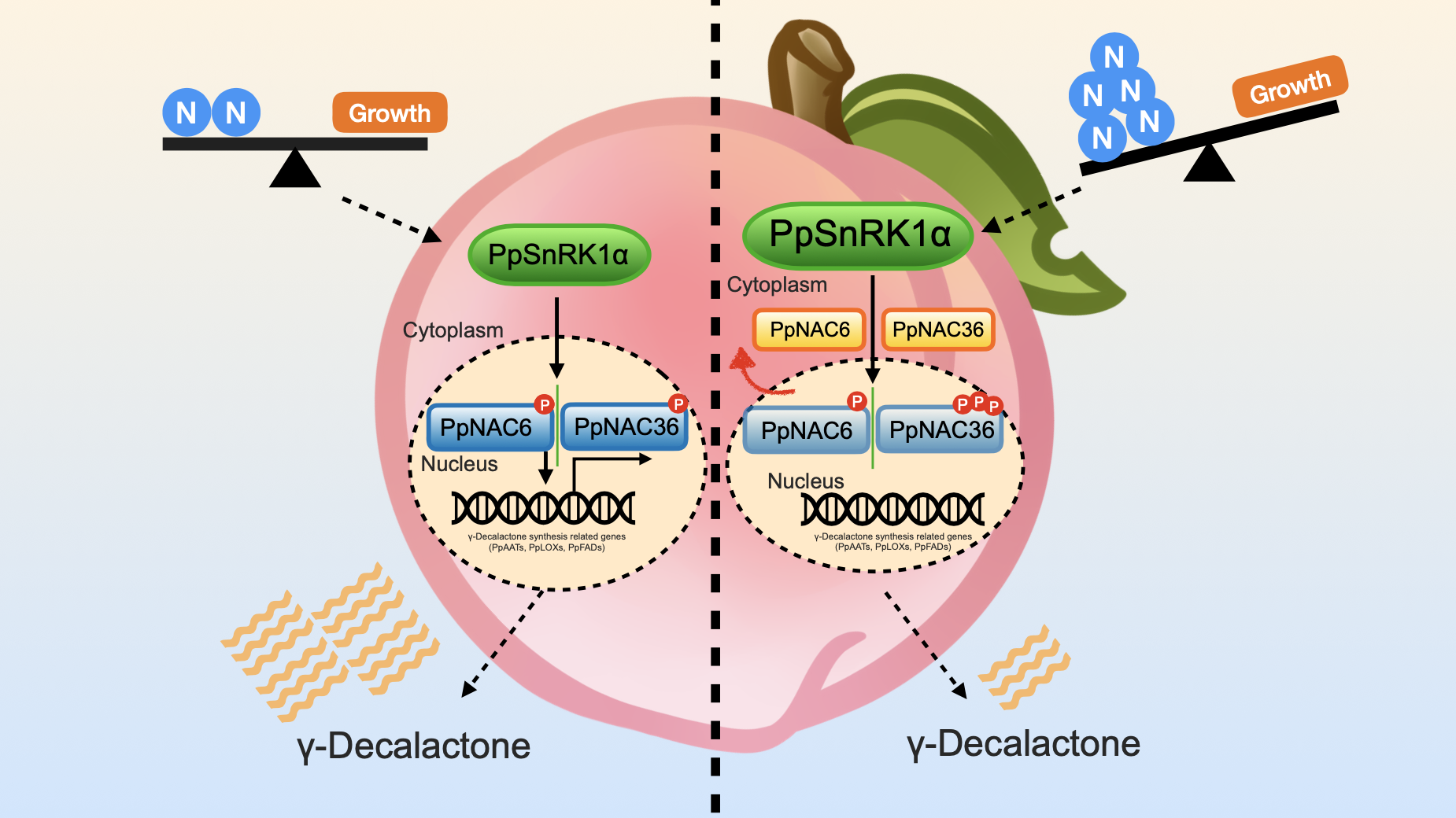 桃子因其独特的香气和风味深受消费者喜爱,具有重要的经济与营养价值。在成熟过程中,桃子会由“青草香”逐渐转变为以酯类和内酯类为主的“果香”,其中γ-癸内酯正是构成其典型“桃香”的核心物质。然而,过量施氮肥会显著降低桃子香气物质积累,成为桃产业可持续发展的主要障碍。因此解析氮素调控“桃香”合成背后的关键因子及其作用机制对桃产业的发展至关重要。