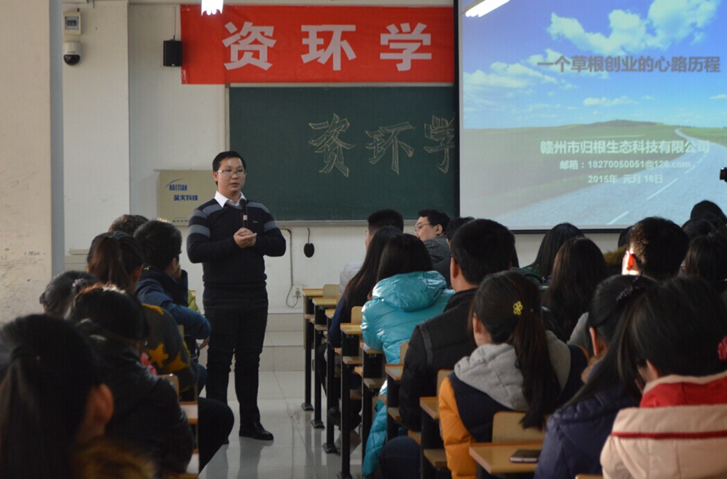 刘军是资环学院2004级农业资源与环境专业学生,环境生物研究协会发起人,硕士研究生毕业后回到家乡自主创业,他在第二届“赢在江西”青年创新创业大赛中凭借“用猪粪来养蚯蚓,再用蚯蚓来改善土质”创业项目赢得冠军,通过不懈的努力,最终创立赣州归根生态科技有限公司。刘军在讲述自己的创业历程时讲到,作为一个草根要想创业,首先要有明确的目标,要立志,其次要不断的学习,既要学习专业的知识也要学习做人做事的道理。另外,创业的过程也是对意志的磨练,他在创业过程中遇到过很多困难,但他一直没有放弃。凭借着坚定的信念,不懈的奋斗,最终取得事业的成功。在报告会的最后,他说到, “同学们在大学要努力学习,对自己严格要求,锻炼坚强意志,坚持做好每一件事。也许今天很残酷,明天也很残酷,但是,后天一定会很美好。”