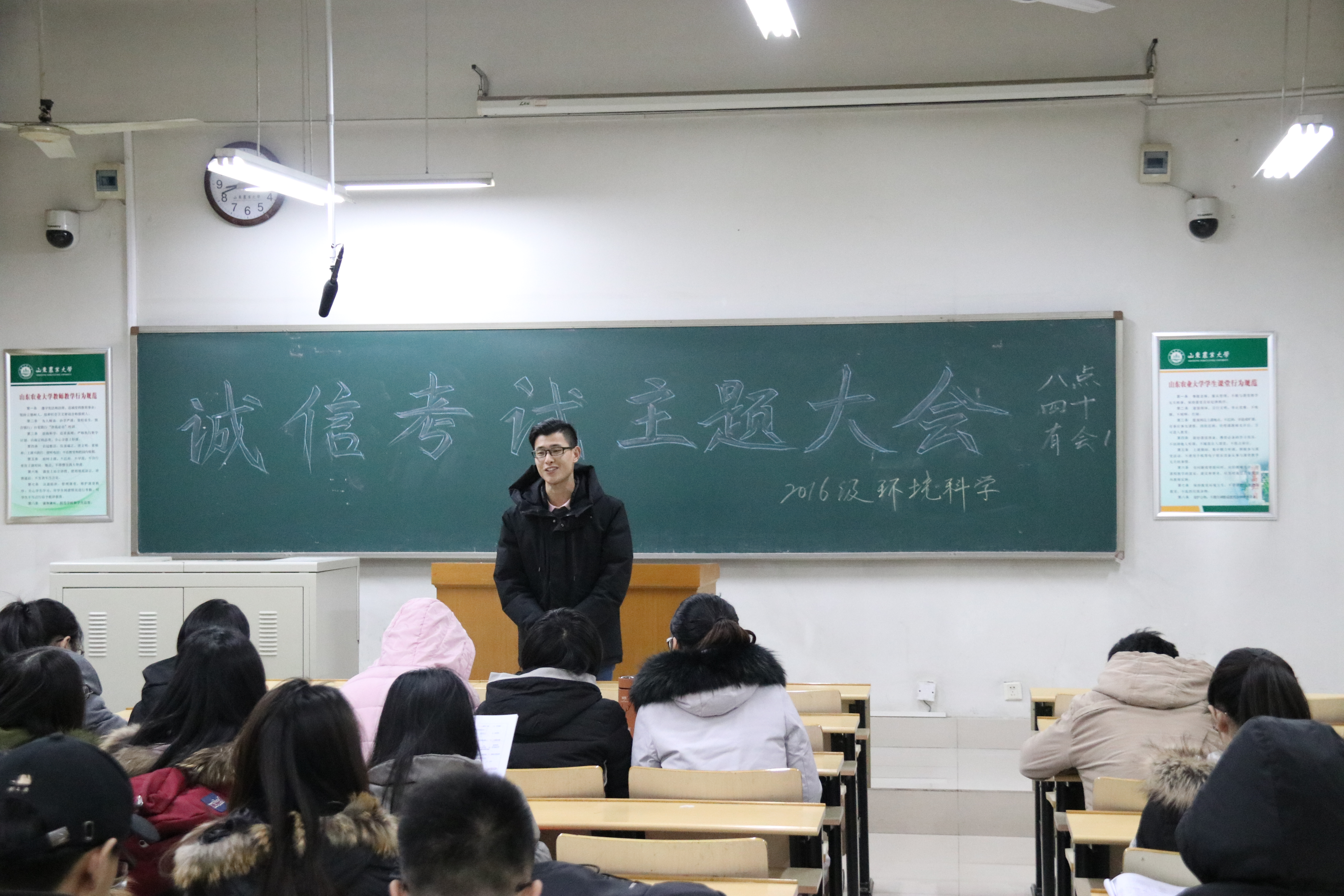 为引导同学们树立正确的考试观念,让同学们积极面对考试,资环学院2016级环境科学专业的2个班级分别于1月11日与12日在综合楼S区教室举行“诚信考试”主题班会,会议由各班班长主持,全班同学积极参加。