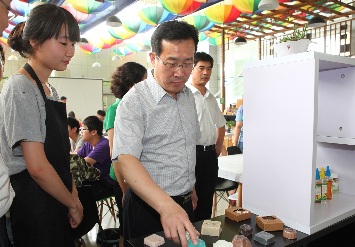 七色土创客驿站,徐书记与学院创新创业团队负责人进行了深入交流。当了解到学院为促进大学生创新创业及就业工作,建立了创客驿站,为大学生提供激发创业灵感、开展校园文化活动、加强师生交流、实现资料共享以及促进学生创业就业实践的平台,前期已投入十万余元用于优化环境,购置图书与设备,目前已有9个创业团队入驻并有4个创业项目已经注册为创业实体,相关高校领导多次到创客驿站调研指导工作,已初步成为我校创新创业工作新的增长点和对外展示的新窗口的情况后,对学院在大学生创新创业工作中取得的成绩给予了肯定,徐书记详细询问了项目建设和运营过程中遇到的问题和困难,并品尝了由阅味书屋创业团队和Roverkids港式甜品创业团队所制作的饮品及甜点,气氛亲切融洽。徐书记在调研中指出:国家高度重视大学生创新创业人才培养,这是大学生发挥创业才干的历史机遇。同学们要抓住时机,不畏困难,勇于创新,提升创业意识,磨炼创业技能,为日后走向社会,更好地就业创业打下坚实基础并希望学院再接再厉,再创佳绩。