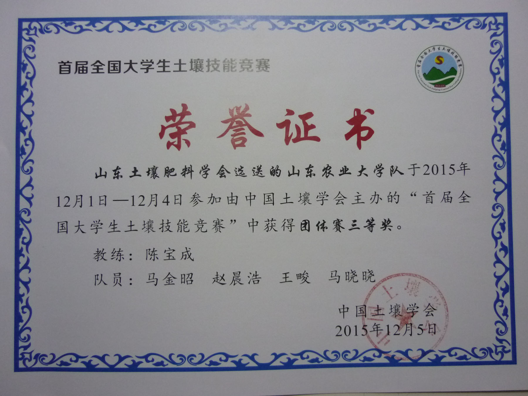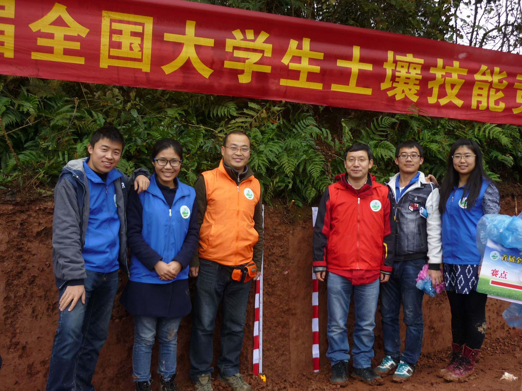 经“山东土壤肥料学会”推荐,我院张民、李成亮老师领队,陈宝成老师作为教练,马金昭、赵晨浩、王畯、马骁骁同学代表山东农业大学于2015年12月1-5日参加了由中国土壤学会主办,中国土壤学会土壤发生、分类与土壤地理专业委员会,重庆土壤学会,中国土壤学会教育工作委员会,西南大学资源环境学院承办的“首届全国大学生土壤技能竞赛”。