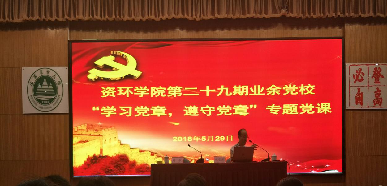 为提高党员、积极分子的党性修养、理论水平,5月29日,资环学院于南校区第一学术报告厅举办第二十九期业余党校第二次专题党课。学院党委书记朱宝库作了“学习党章,遵守党章”的主题报告,团委书记刘敏主持报告会,院团委老师出席活动,学院全体党员及入党积极分子参加了本次党课培训。