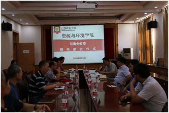 2018年6月1日下午,山东农业大学杰出校友赵鲁全兼职教授聘书颁发仪式在资环学院3号楼320会议室举行。山东省国土资源厅土地调查规划院赵鲁全主任、翟荣新所长、张勇所长、许志伟科长,资环学院党委书记朱宝库、副院长齐伟、学科主任李新举、王瑷玲、朱西存、陈红艳等专业教师代表参加聘任仪式。学科主任李新举主持仪式。