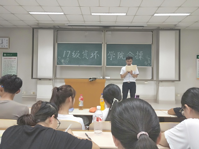 8月29日晚,资环学院于南校区综合楼N304教室召开2017级全体学生新学期大会操,大会对大一作了总结,对近期学校、学院工作部署安排作了传达,对本学期工作、学习、生活相关事宜作了说明并提了要求。团委老师王艳廷出席会议,2017级全体学生参加会议。