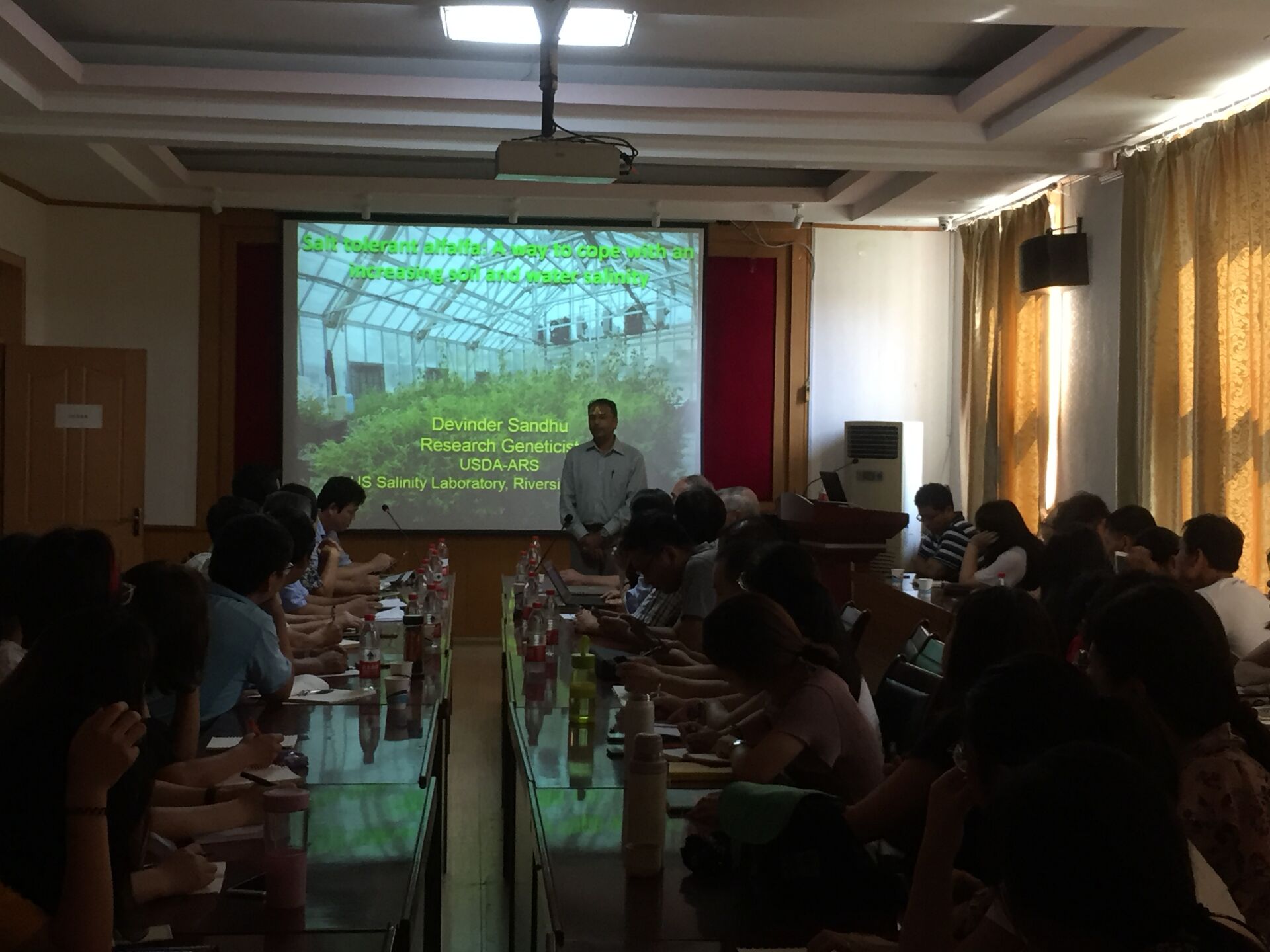 Devinder Sandhu教授是植物遗传学领域的著名专家,曾任威斯康辛大学史帝文分校生物学系教授,现任美国农业部农业研究中心盐土实验室土壤水盐再利用与修复研究组主管,在植物基因领域有多年研究经验,他在“高耐盐牧草的培育与效果”的报告中,从生物改良技术方面入手,为我们分享了高耐盐牧草培育技术,以及不同培育方式下牧草生长状况,详细介绍了高耐盐牧草的培育环境。