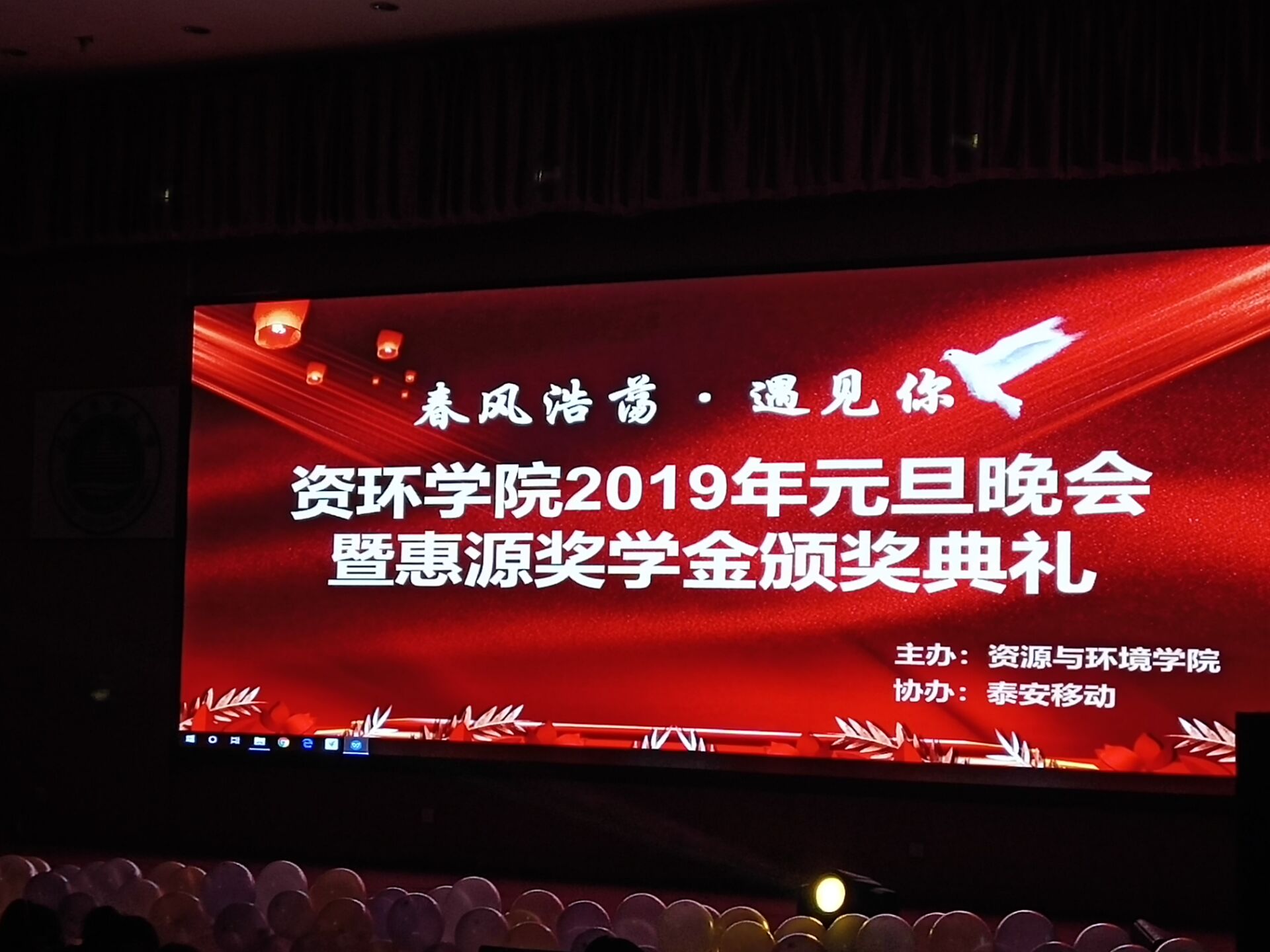 12月24日,资源与环境学院2019年“春风浩荡·遇见你”主题元旦晚会暨惠源奖学金颁奖典礼于南校区第一学术报告厅举办。本次活动由资源与环境学院主办,泰安移动承办。本次活动汇集了形式多样、精彩纷呈的文艺节目,为与会嘉宾、观众带来了一场视觉盛宴,展现了资环学子新姿态、新风貌。