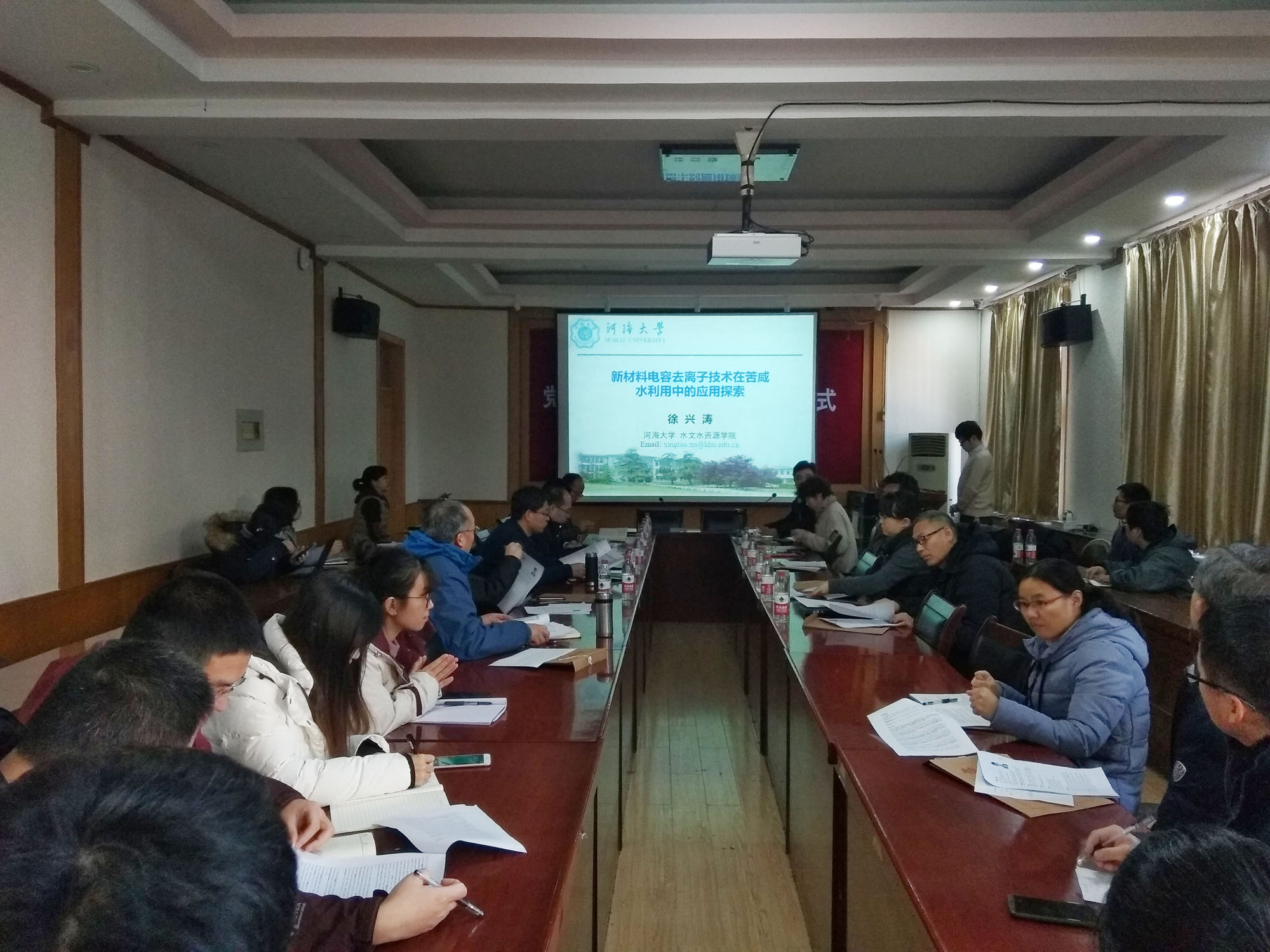 徐兴涛博士,现为河海大学水文水资源学院特聘副教授。他从电容构件的制备、新型材料的持续稳定性、应用研究以及研究结论四个方面进行报告。徐博士从我国严峻的水资源形势入手,介绍了多孔电极碳材料技术处理苦咸水的优点,并以简单清晰的原理图介绍了新材料电容脱盐技术的原理和进展,形象生动的讲解方式给同学们带来启发。此外,徐博士还介绍了他的最新研究成果,包括流动电极电容去离子技术、超越碳材料的新型电极构筑等。最后,徐博士对其未来的工作方向进行了简明的介绍。