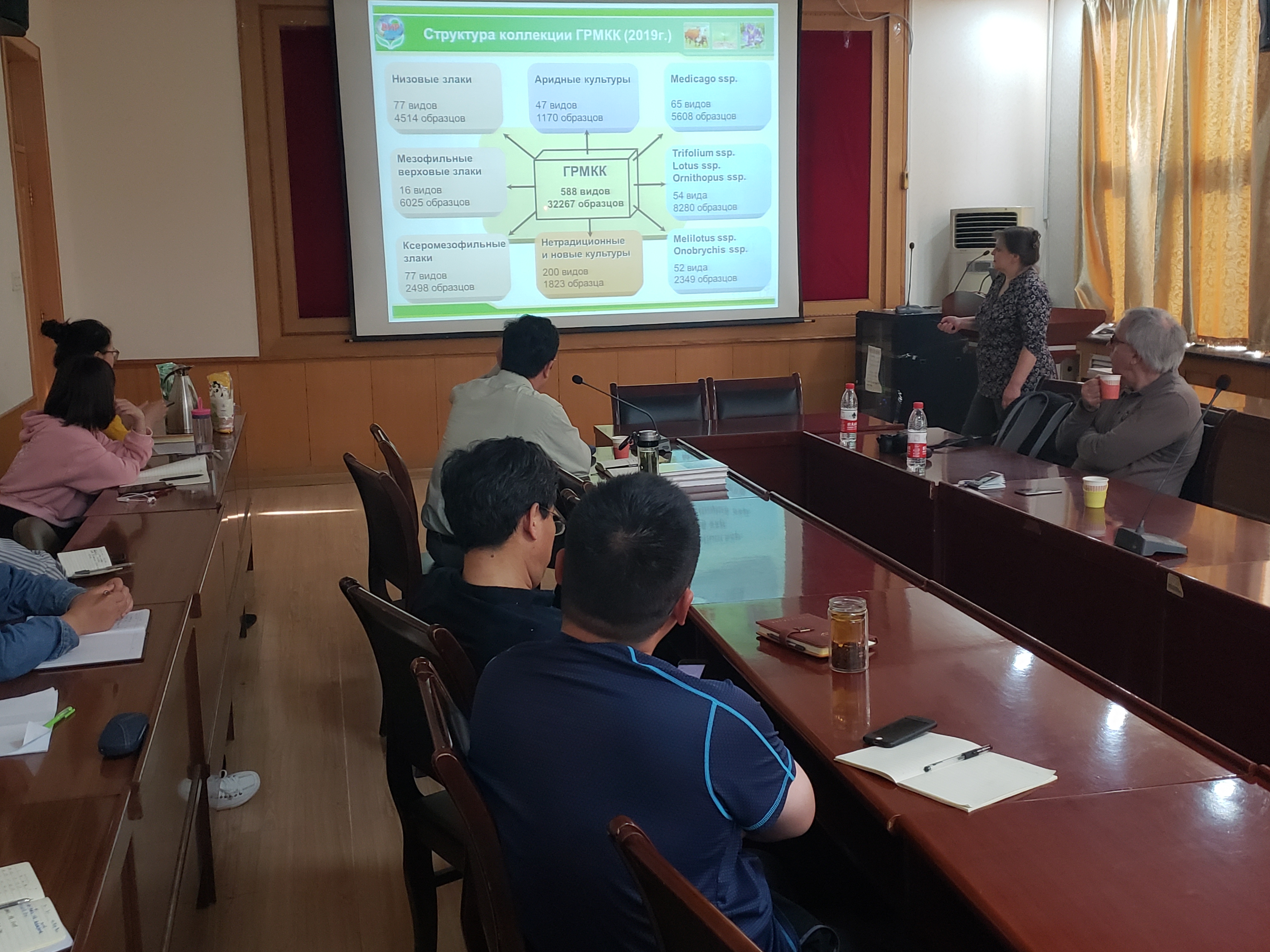 尼古拉•久班克的报告围绕瓦维洛夫作物资源展开,以世界植物遗传资源和它们的野生同族的重要引进方向作为概述,详细介绍了植物学、进化、系统发育学和植物分类、遗传、生理、生物化学免疫性、农业气象、分子生物学等方面新的基础理论知识,并在此基础上开发高效育种的工艺,图文并茂地讲述了高效育种工艺对当代生产生活的重要意义,同时对我校育种工作表现出极大兴趣,并欢迎资环研究生们前往瓦维洛夫全俄植物遗传资源研究所交流学习。