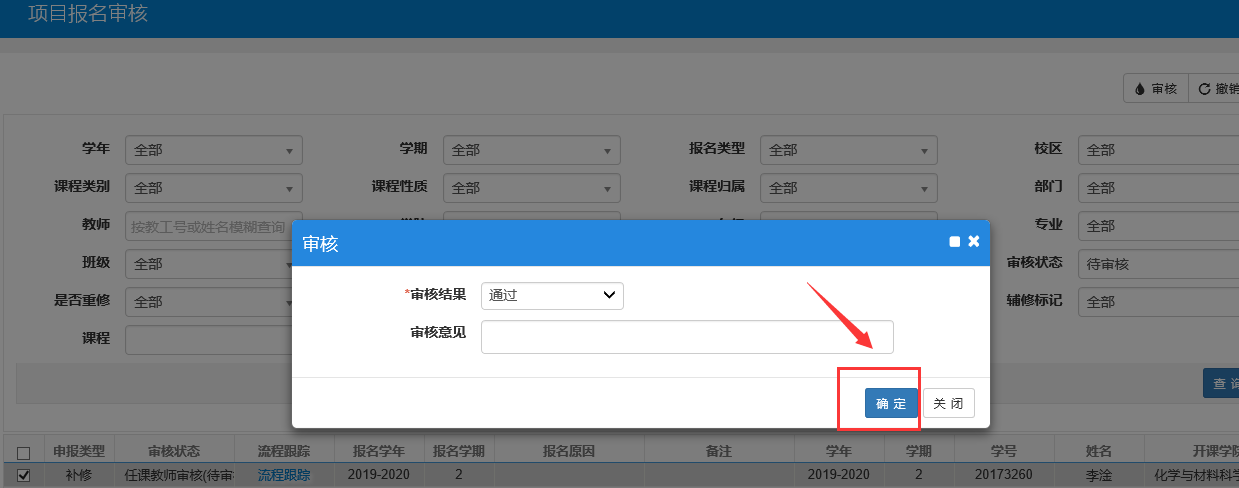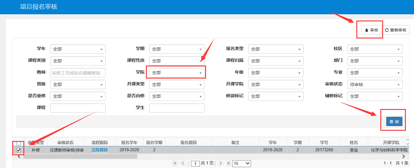 、在项目报名审核菜单,将学院改为全部,点击查询,选中申请的补修,点击右上角审核按钮,选择通过或者不通过,点击确定即可。