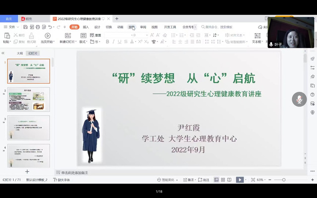 为迎接即将召开的党的二十大,提高我院研究生科研能力和提升研究生心理素质,资环学院于2022年9月25日上午举办线上“图书馆入馆学习讲座和心理健康教育”。学院有幸邀请到我校大学生心理教育中心尹红霞老师、图书馆资源建设部杨歆歆老师进行授课,副院长朱西存主持,辅导员程蕾、全体研一新生参加本次讲座。