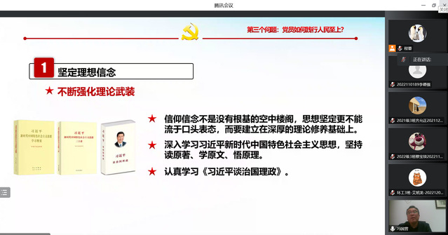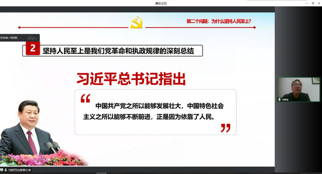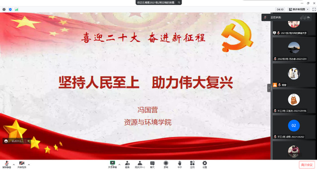 为迎接即将到来的中国共产党第二十次全国代表大会的召开,10月15日下午,资环学院党委书记冯国营以“坚持人民至上,助力伟大复兴”为主题,为学院全体研究生上了一堂意义深远的线上主题党课,辅导员程蕾和全体研究生参加本次主题党课。