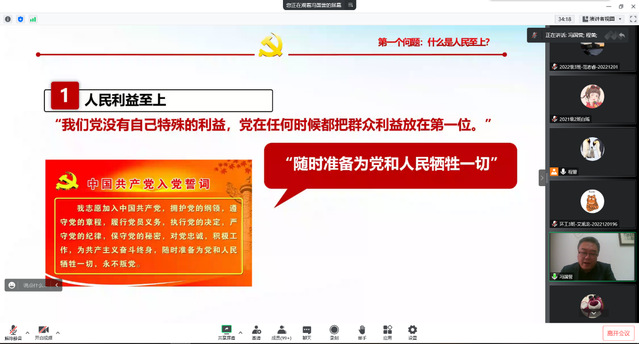 冯书记首先从“什么是人民至上”出发,为大家传达了我们党全心全意为人民服务的宗旨观念和以人民为中心的发展思想,随后又从三个方面为大家讲述了“为什么坚持人民至上”,最后通过坚定理想信念,树牢宗旨意识,践行群众路线四个方面阐述了“党员如何践行人民至上”。