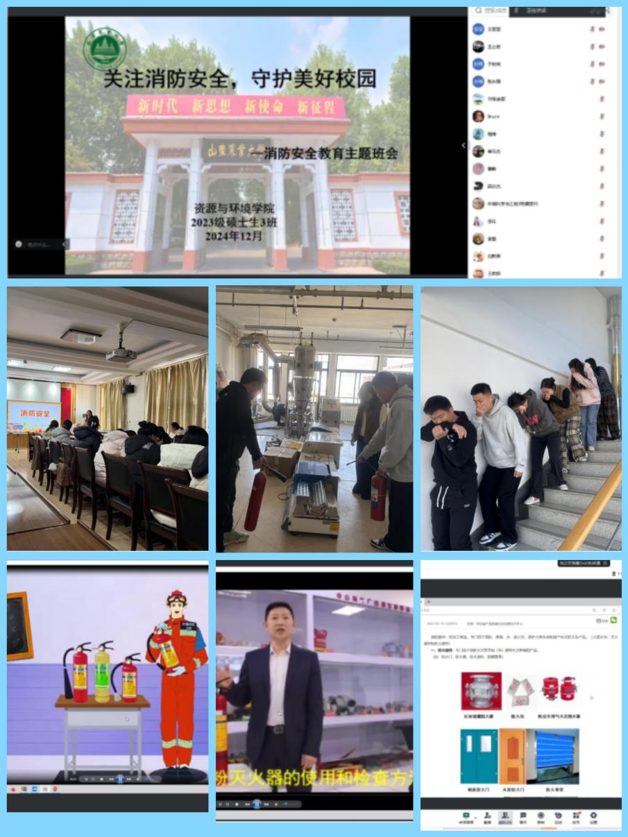此外,自12月初起,各班级分别采用线上线下相结合的方式召开以“消防安全”为题的班会。其中,2022级博士班通过线上会议组织班级同学集体观看动漫版和真人演示版的消防安全教育视频,进一步增强同学们的消防安全责任感和法律意识;2023级研究生四班特别组织了线下消防安全演练,通过模拟火场逃生、正确使用灭火器等实际操作,让同学们亲身体验了火灾应急处理的全过程;其余的各研究生班级分别对消防安全知识进行讲解,对火场逃生进行演练等,不断增强同学们对消防安全的认识。