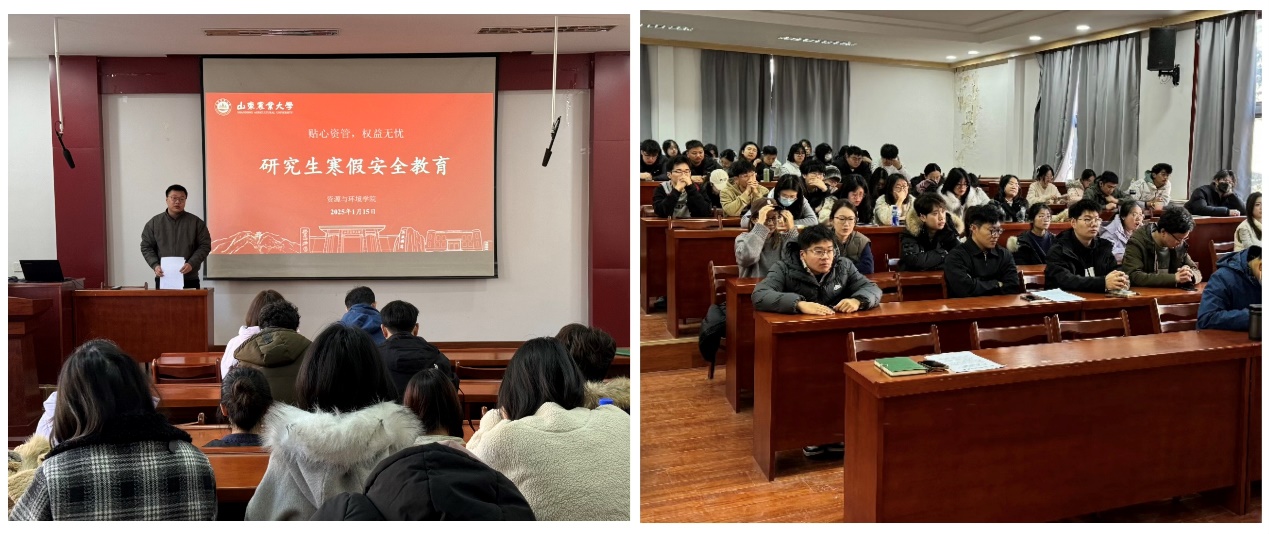 1月15日,资源与环境学院副院长朱西存及研究生辅导员程蕾、孟凡月出席寒假安全教育大会,向在校研究生强调假期安全注意事项,重点围绕实验室安全、宿舍安全、网络安全、交通安全、假期安全等多个方面展开安全教育讲解,为同学们敲响安全警钟,提高了同学们的安全防范意识和自我保护能力,同时为构建平安校园、和谐假期奠定坚实基础。