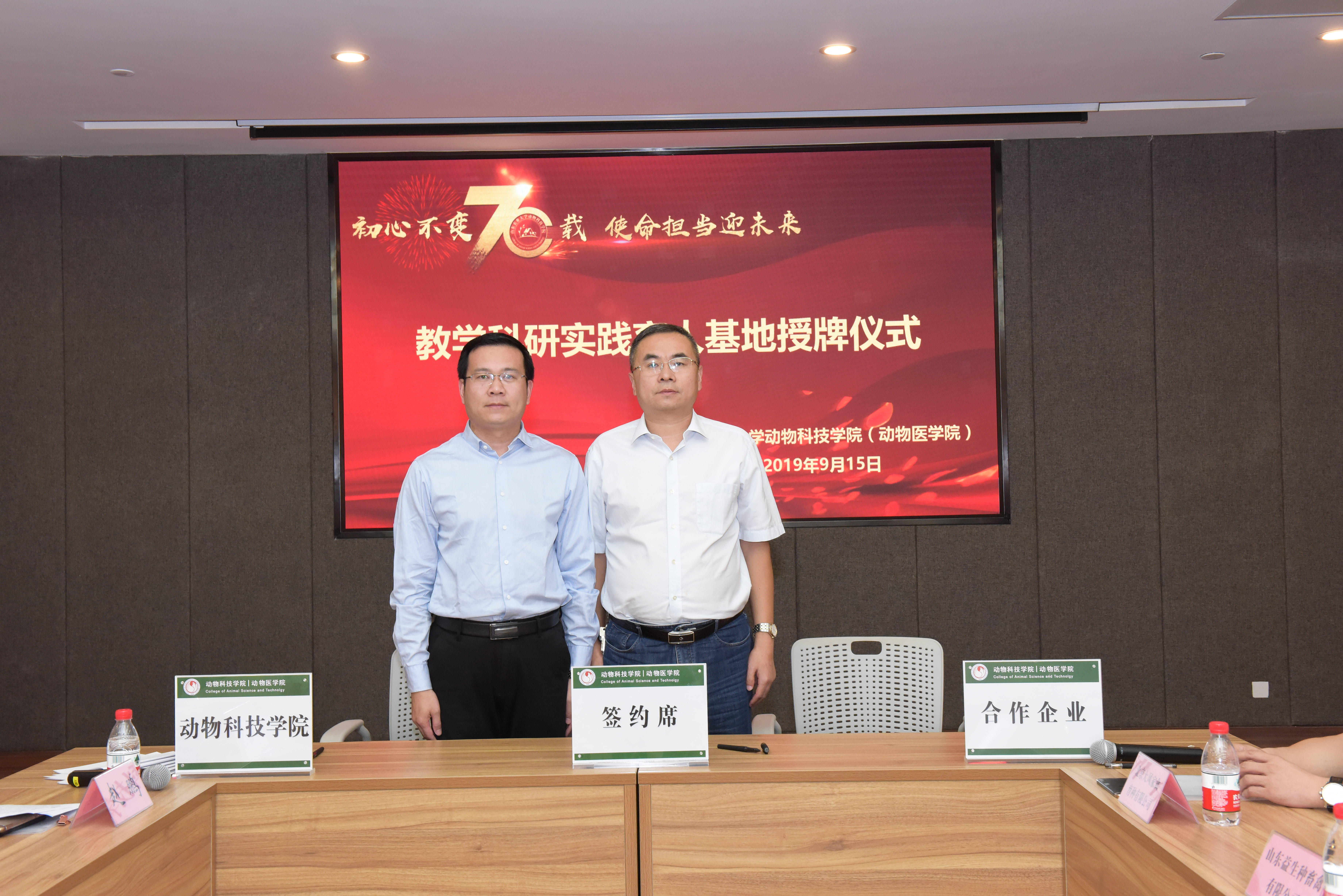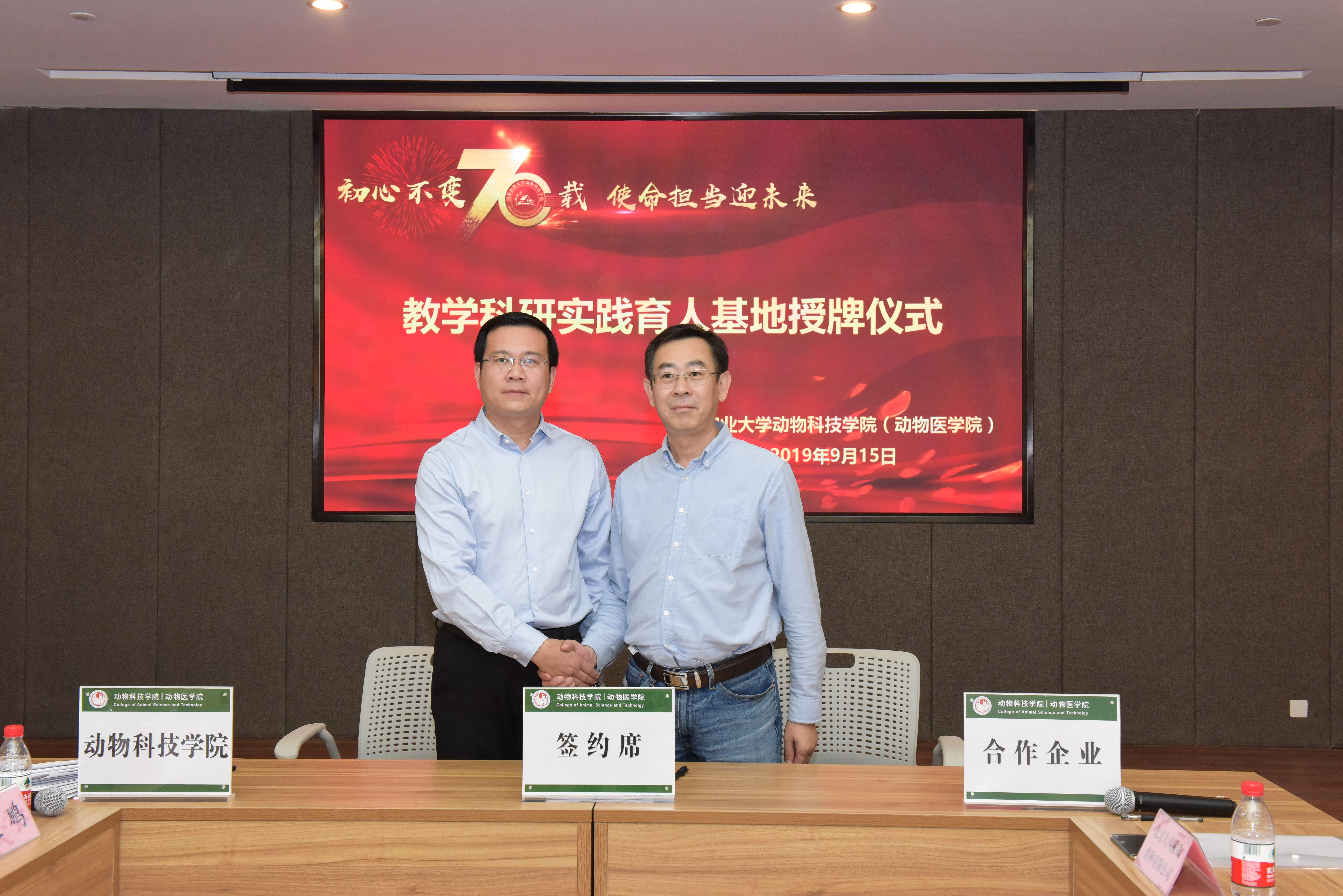 随后,赵鹏代表学院与农业农村部中国动物卫生与流行病学中心、北京大风家禽育种有限公司等14家单位一一签约,学院院长林海教授和党委书记张先岐为新建教学科研实践育人基地授牌。
