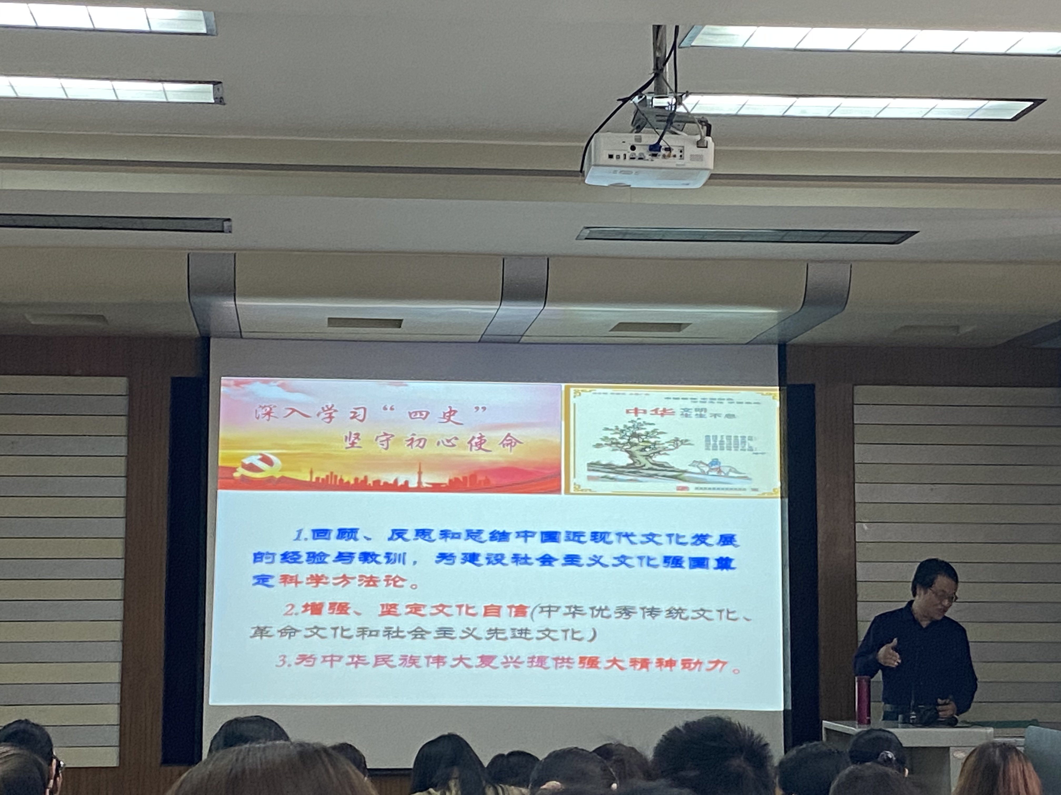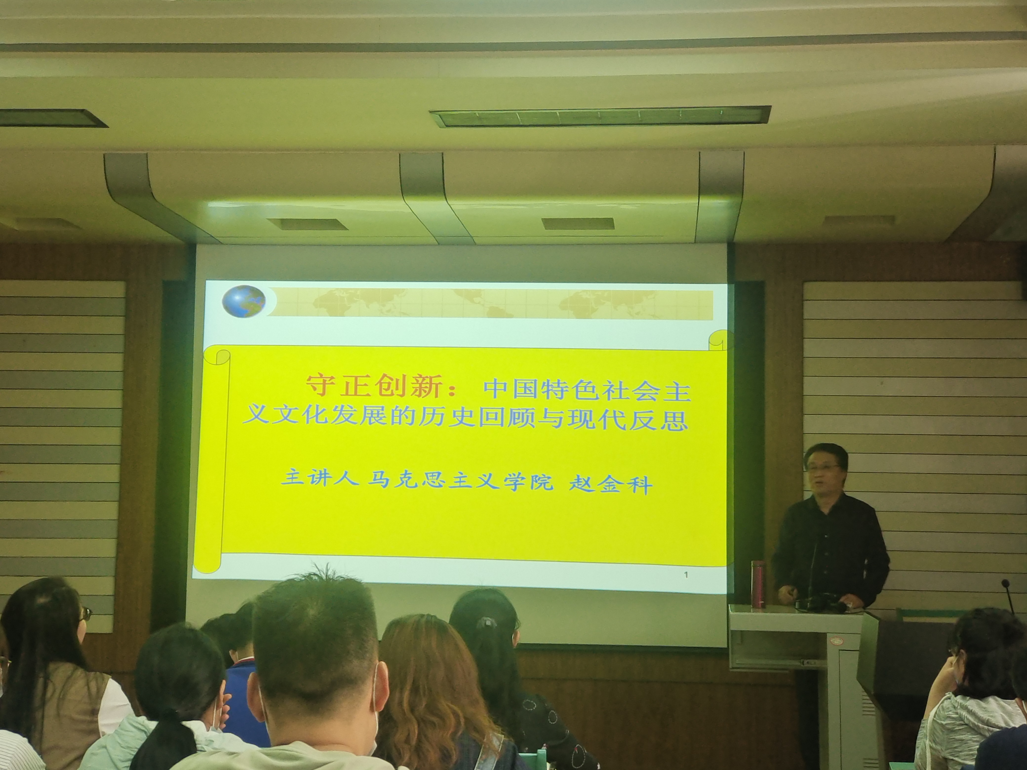 会议邀请马克思主义学院赵金科教授以《守正创新:中国特色社会主义文化发展的历史回顾与现代反思》为题,作了专题辅导报告,从古代中国文化、近代中国文化、新民主主义革命文化、文革期间和改革开放初期的文化、社会主义先进文化以及中国特色社会主义文化建构的科学方法论等六个方面回顾、反思和总结了中国近现代文化发展的经验与教训。报告内容丰富、案例充实、深入浅出,具有很强的理论性和思想性。