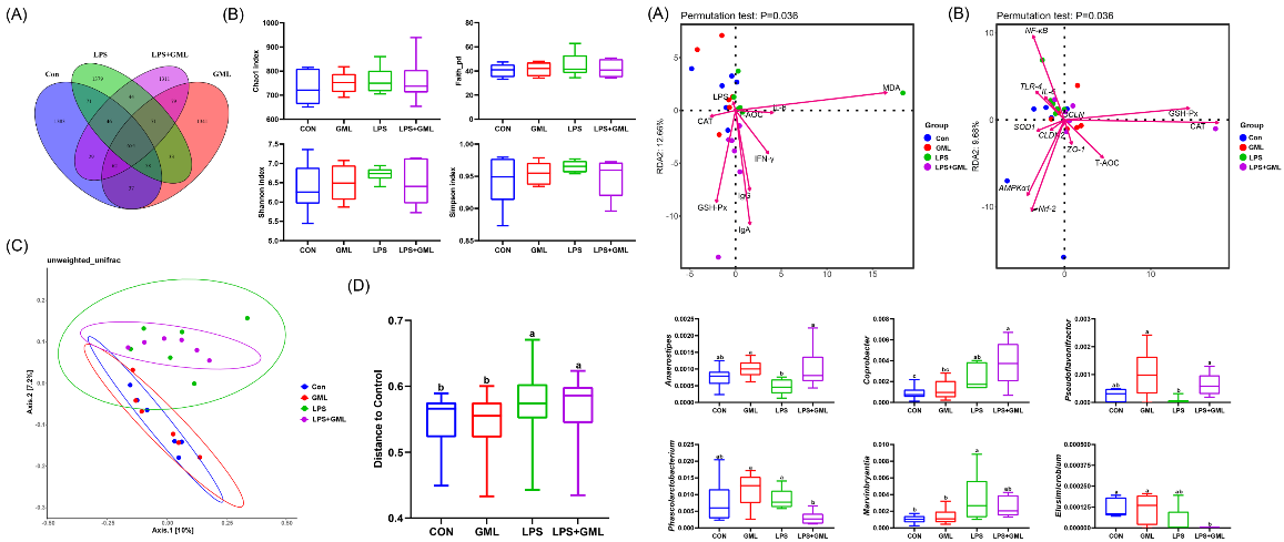 月桂酸单甘油酯(GML)是一种由甘油和月桂酸组成的化合物,天然存在于椰子油、母乳和美洲蒲葵中,具有广泛的免疫调节特性,被认为是安全有效的抗生素促生长添加剂替代产品。虽然GML的有益作用正在逐渐得到认可,但其作用机制尚不清晰。本研究发现日粮中添加1200mg/kg GML可通过抑制炎症和氧化应激来改善LPS诱导的肉鸡免疫应激和肠道损伤。其中,GML诱导的盲肠微生物群的改变可能是肉鸡肠道健康恢复的原因之一。此外,本研究证实了GML的免疫调节、抗氧化和抗炎特性,AMPK/Nrf2信号通路的激活参与其功能发挥。